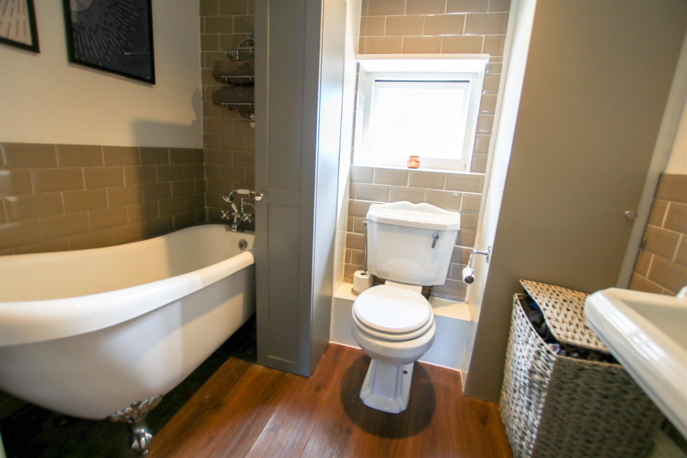 Modern suite with roll top bath, low level W.C. and wash hand basin, tiled splashbacks, double glazed window to rear elevation.
