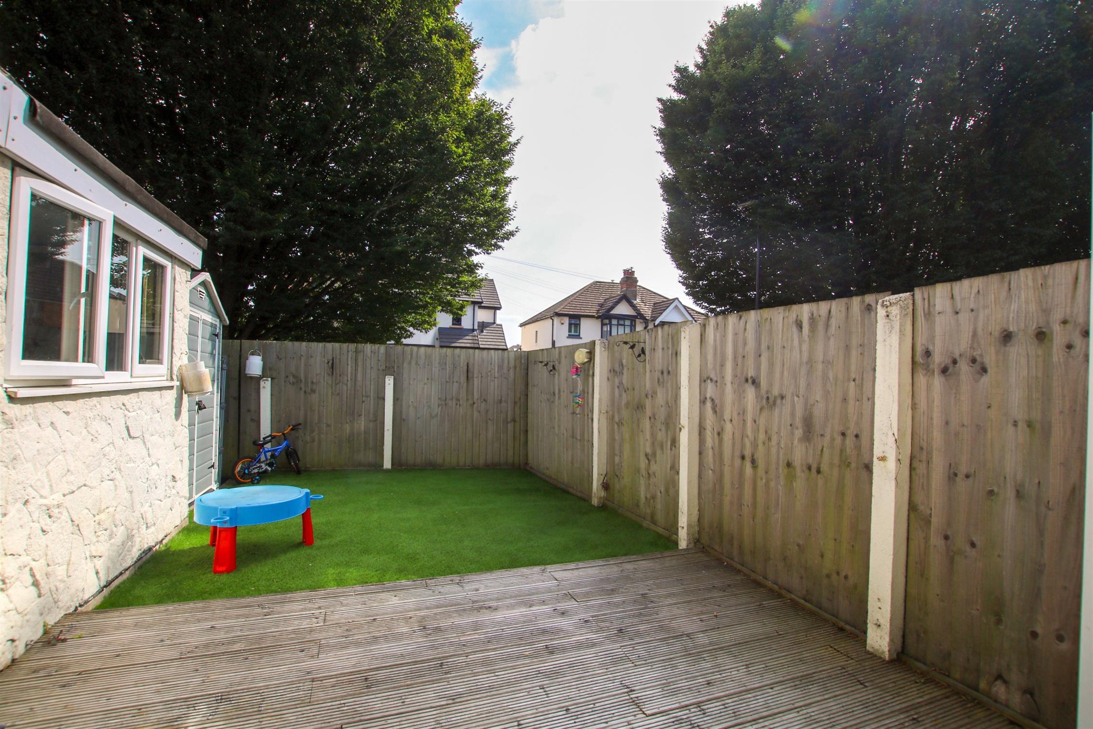 Enclosed with decking and artificial grass.