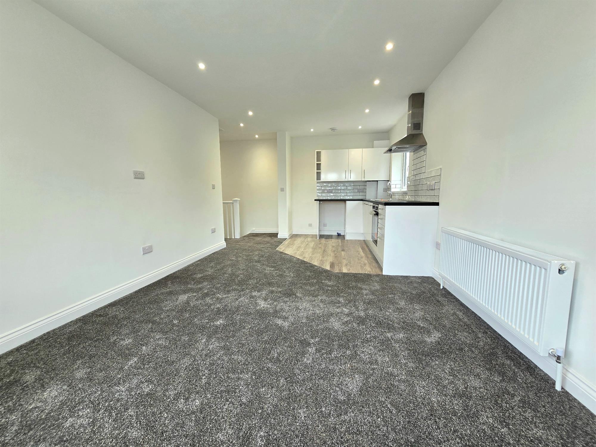 ENTRYWAY – Stairs rising to the first floor, leading to an open-plan lounge and kitchen with doors to the bedroom & bathroom.
