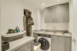 Smooth finish to ceiling with inset spotlights, matching wall and base units with roll top work surface over, stainless steel sink and drainer inset, space for washing machine, integrated tumble dryer, tiled flooring with underfloor heating.