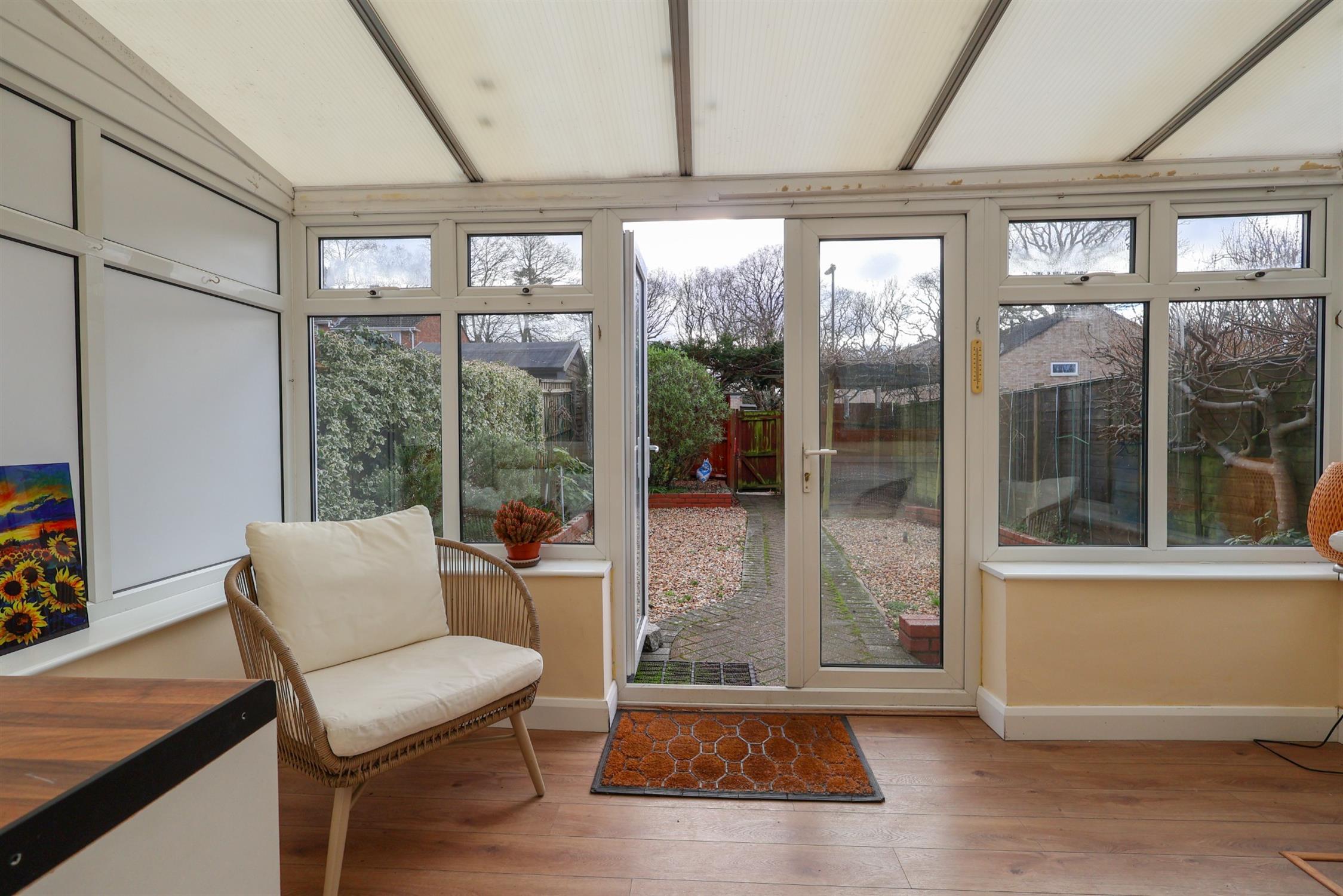Radiator, base and eye level units, inset sink, space for oven, fridge, tiled splash back, doors to conservatory and spotlights.
