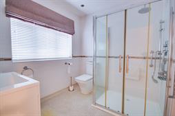 Smooth ceiling with inset spotlights, UPVC double glazed window to front, WC, wash hand basin and large shower cubicle with rainfall-style shower, anti-slip flooring, heated ladder towel rail.