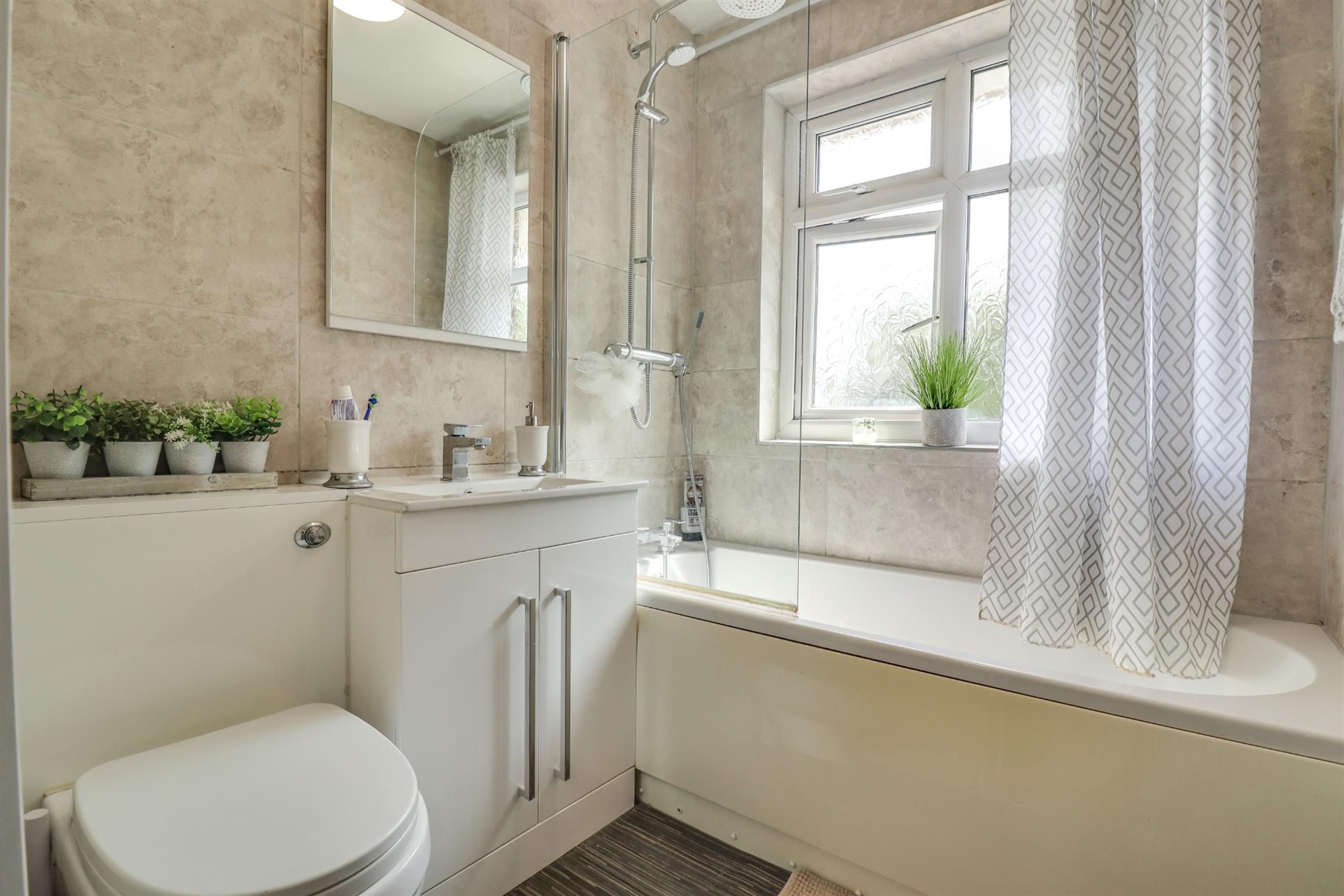 Smooth finish to ceiling, double glazed window to front elevation, panel enclosed bath with mains fed shower over, vanity wash hand basin and low level WC, heated ladder towel rail, fully tiled walls.