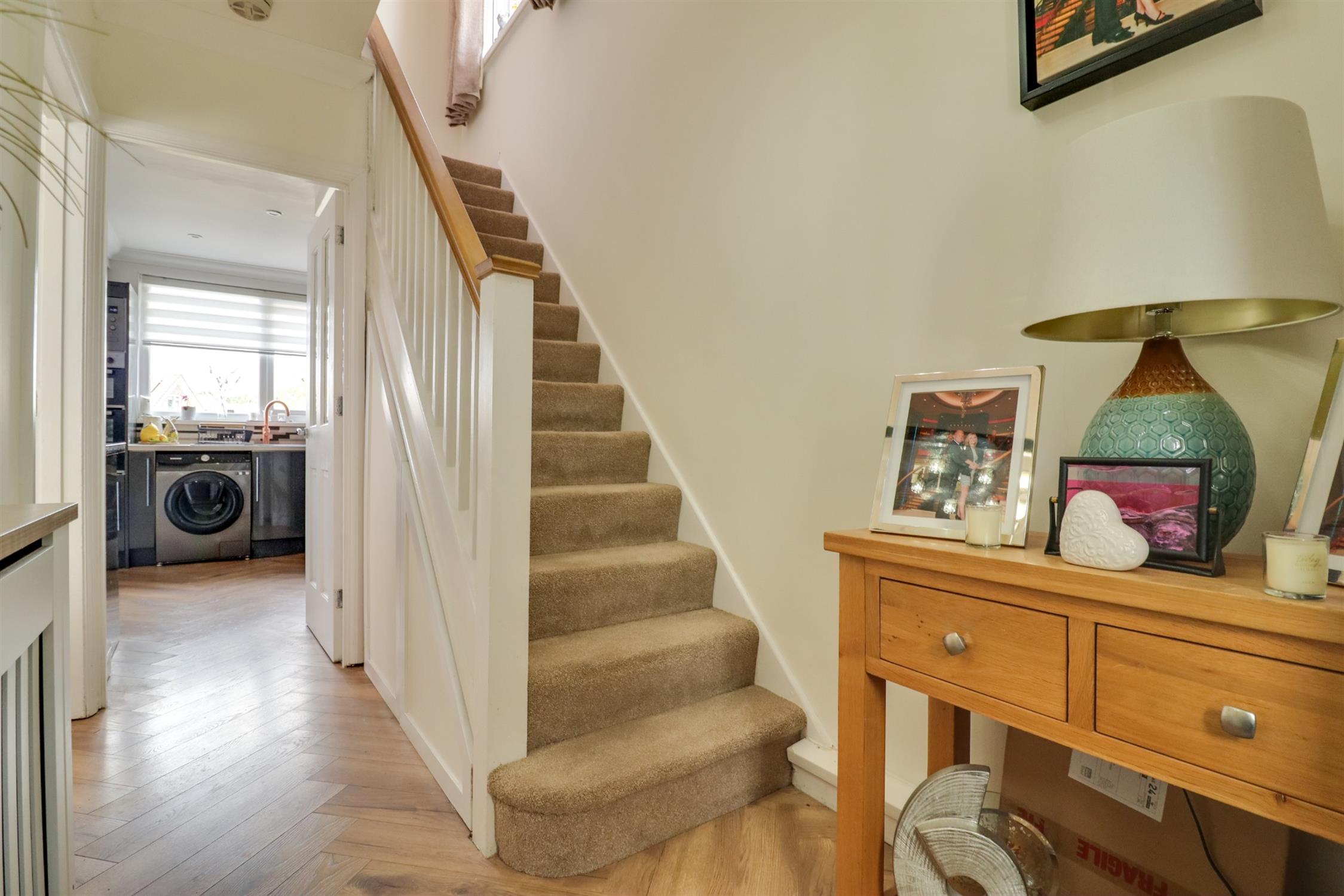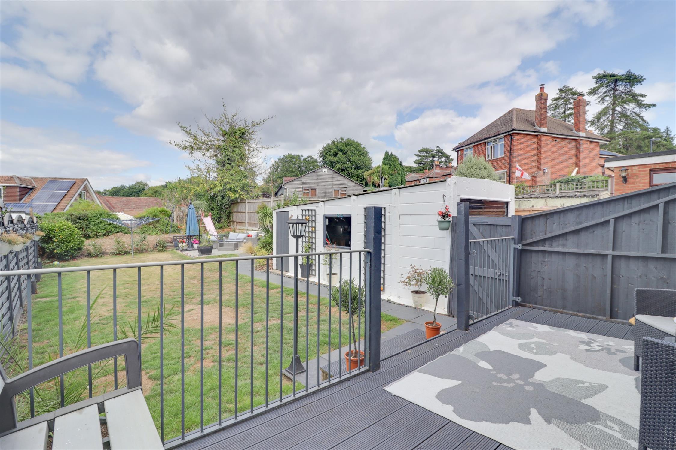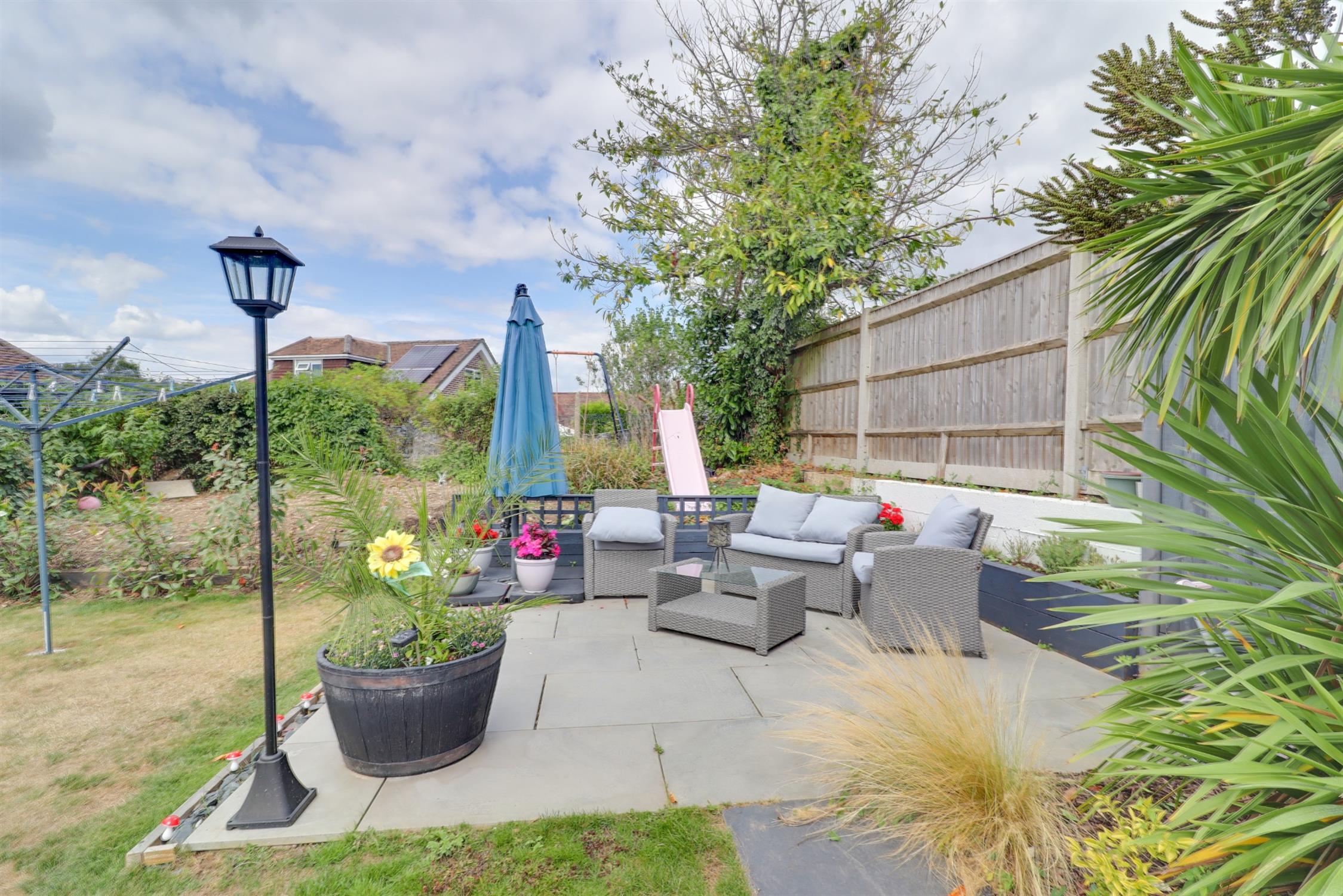 A generous rear garden boasting a patio seating area with steps down to a lawn with shrub borders. At the rear is a decked seating area, shed and a gate providing access onto Shoreburs Greenway. Along with a detached garage with up and over door.