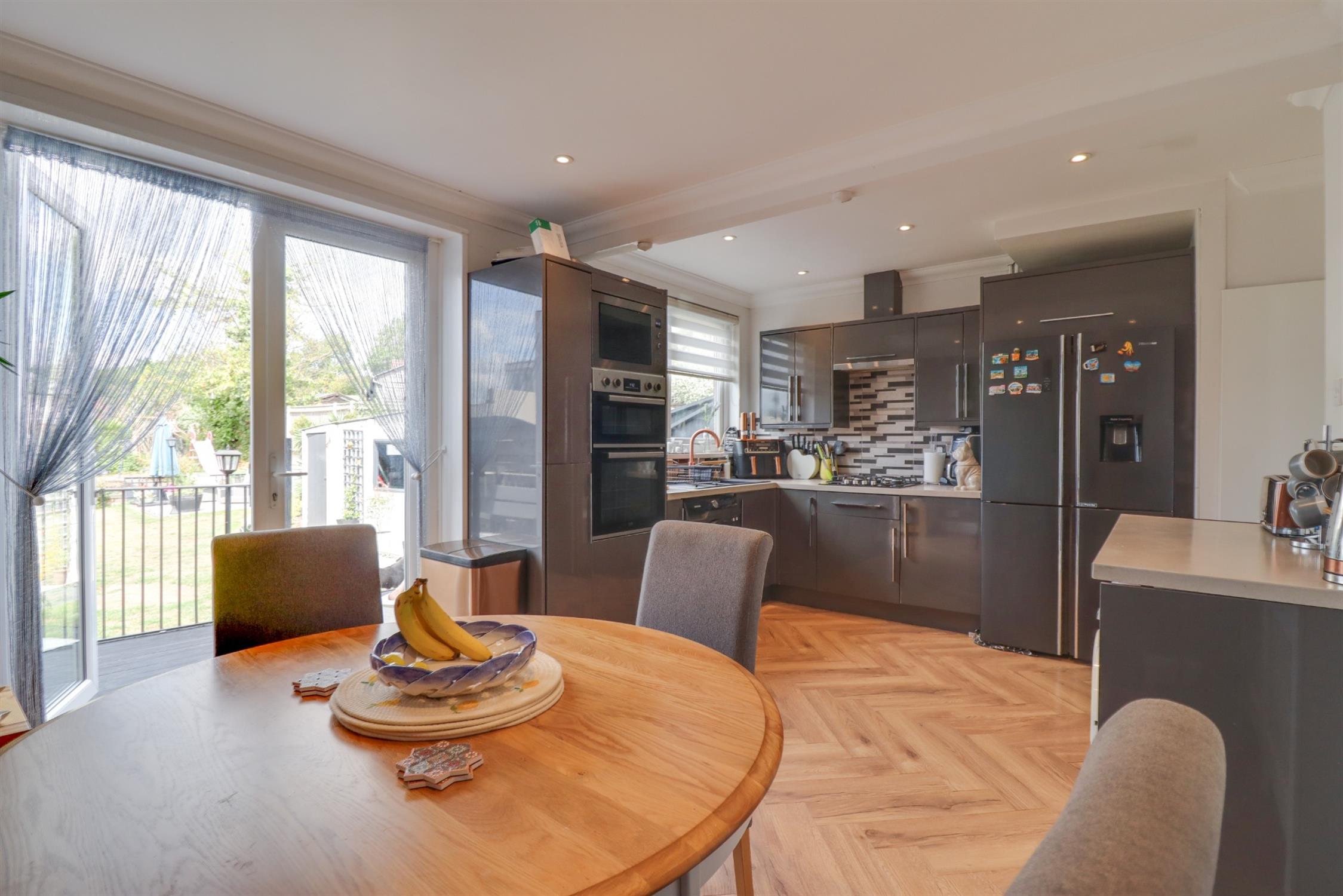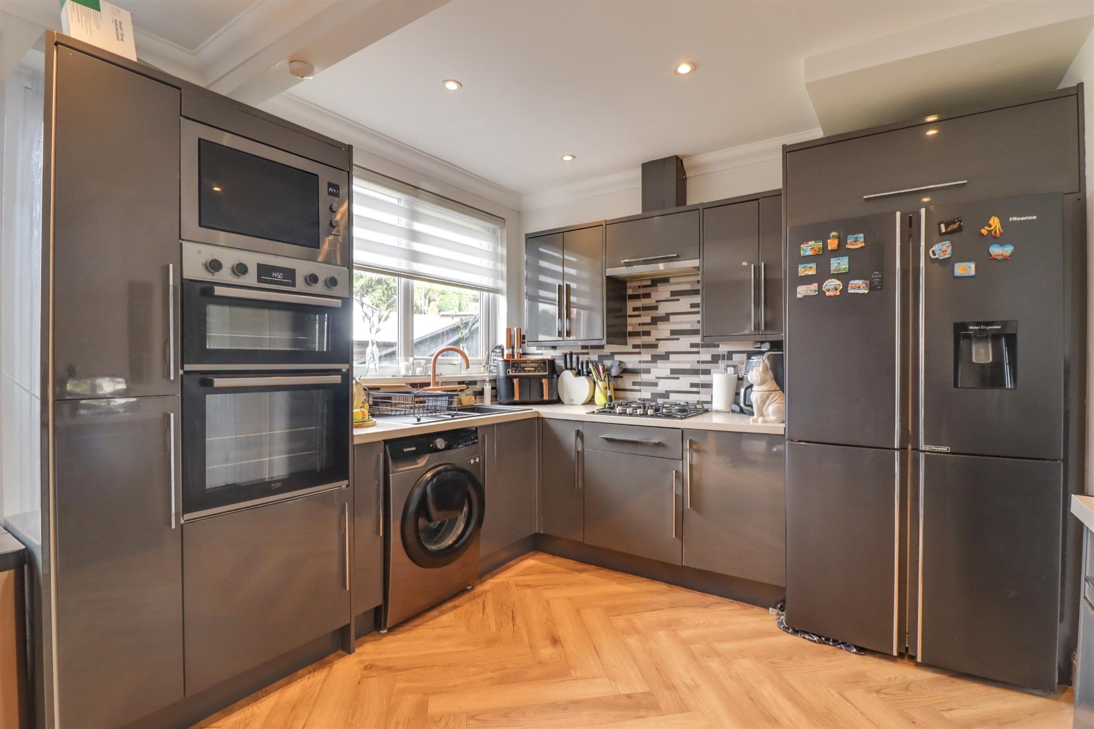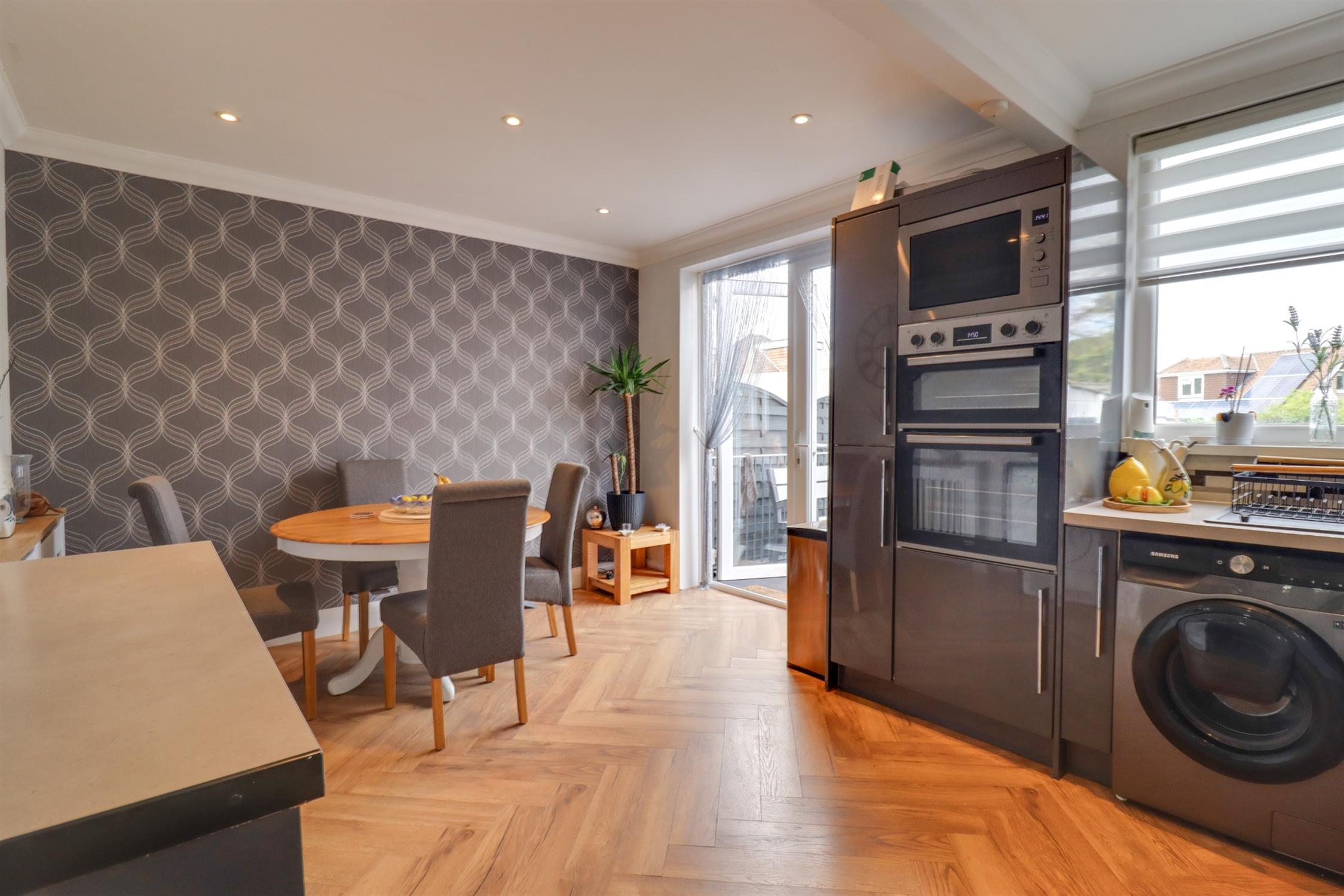 Smooth finish to coved ceiling with inset spotlights, double glazed window to rear elevation, double glazed French doors to rear elevation, range of matching wall base and drawer units with roll top work surface over, sink and drainer inset, Integrated double oven and gas hob with extractor fan over, integrated microwave, space for washing machine, tumble dryer and American style fridge freezer, tiled splashbacks, Herringbone style flooring, radiator.