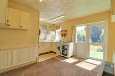 Textured finish to ceiling, double glazed windows to rear and side elevation and double glazed door to rear elevation, range of matching wall base and drawer units with roll top work surface over, stainless steel sink and drainer inset, space for appliances, tiled splashbacks, gas fireplace, under stairs cupboard, radiator.