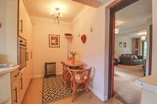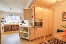 Smooth finish to ceiling, double glazed door to side elevation, double glazed windows to rear and side elevation, range of matching wall base and drawer units with roll top work surface over, sink and drainer inset, integrated oven and hob, space for fridge freezer and washing machine, tiled splashbacks, door to:
