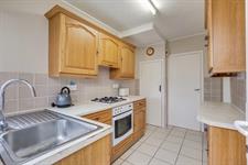 Textured finish to ceiling, double glazed window and door to rear elevation, range of matching wall base and drawer units with roll top work surface over, stainless steel sink and drainer inset, integrated oven and hob with extractor fan over, larder cupboard, tiled splashbacks and flooring.