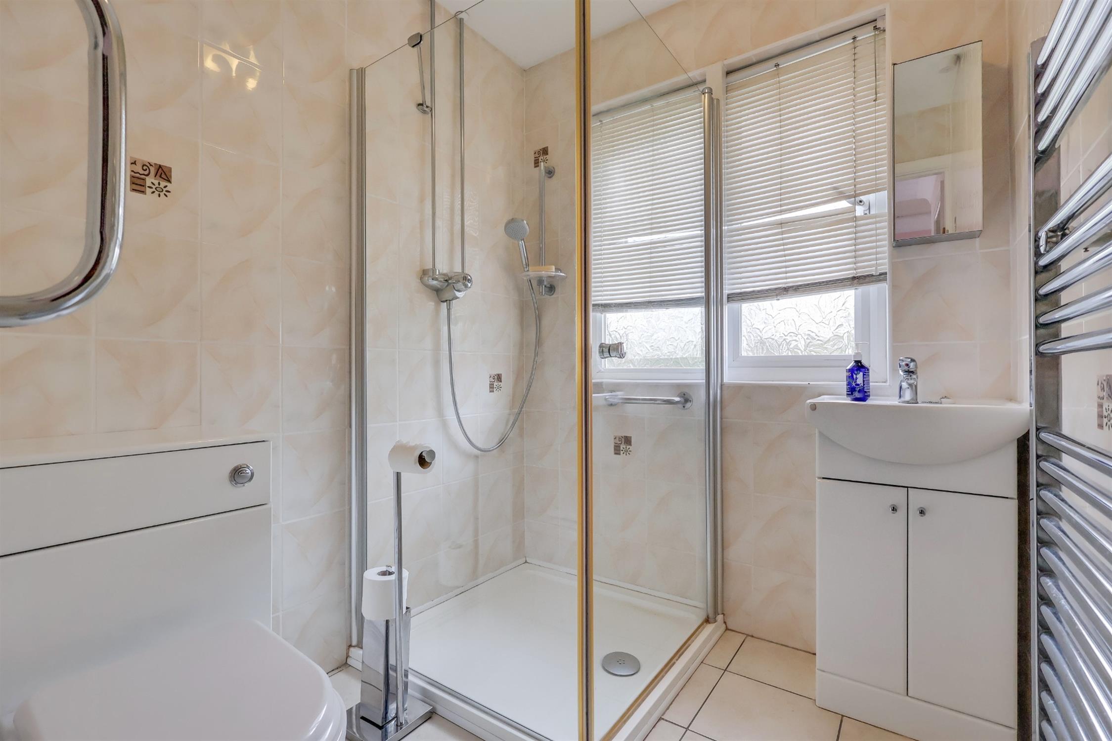 Smooth finish to ceiling, double glazed window to front elevation, corner shower cubicle with mains fed shower over, vanity wash hand basin, low level WC, heated ladder towel rail, fully tiled.