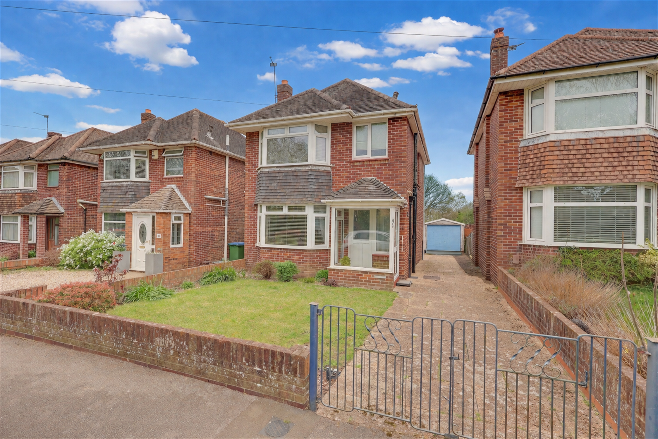 Dropped kerb leading to gated off road parking, low level brick wall border with lawn to side, side access to garage and garden.