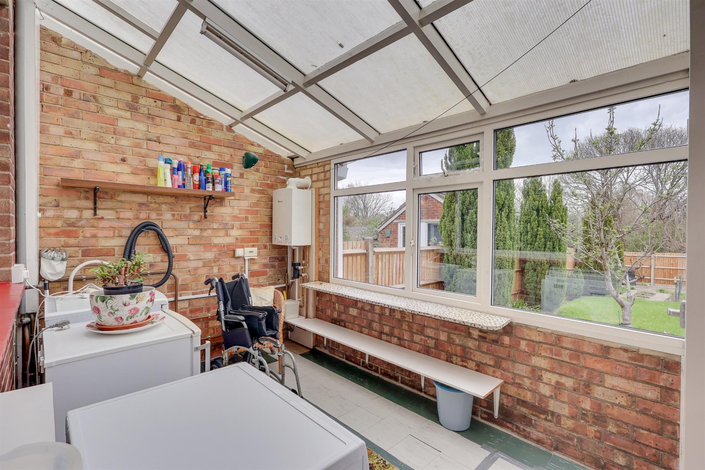 Polycarbonate roof, double glazed windows to rear elevation, double glazed door to side elevation, wall mounted boiler, plumbing and space for washing machine, space for other appliances, door to: