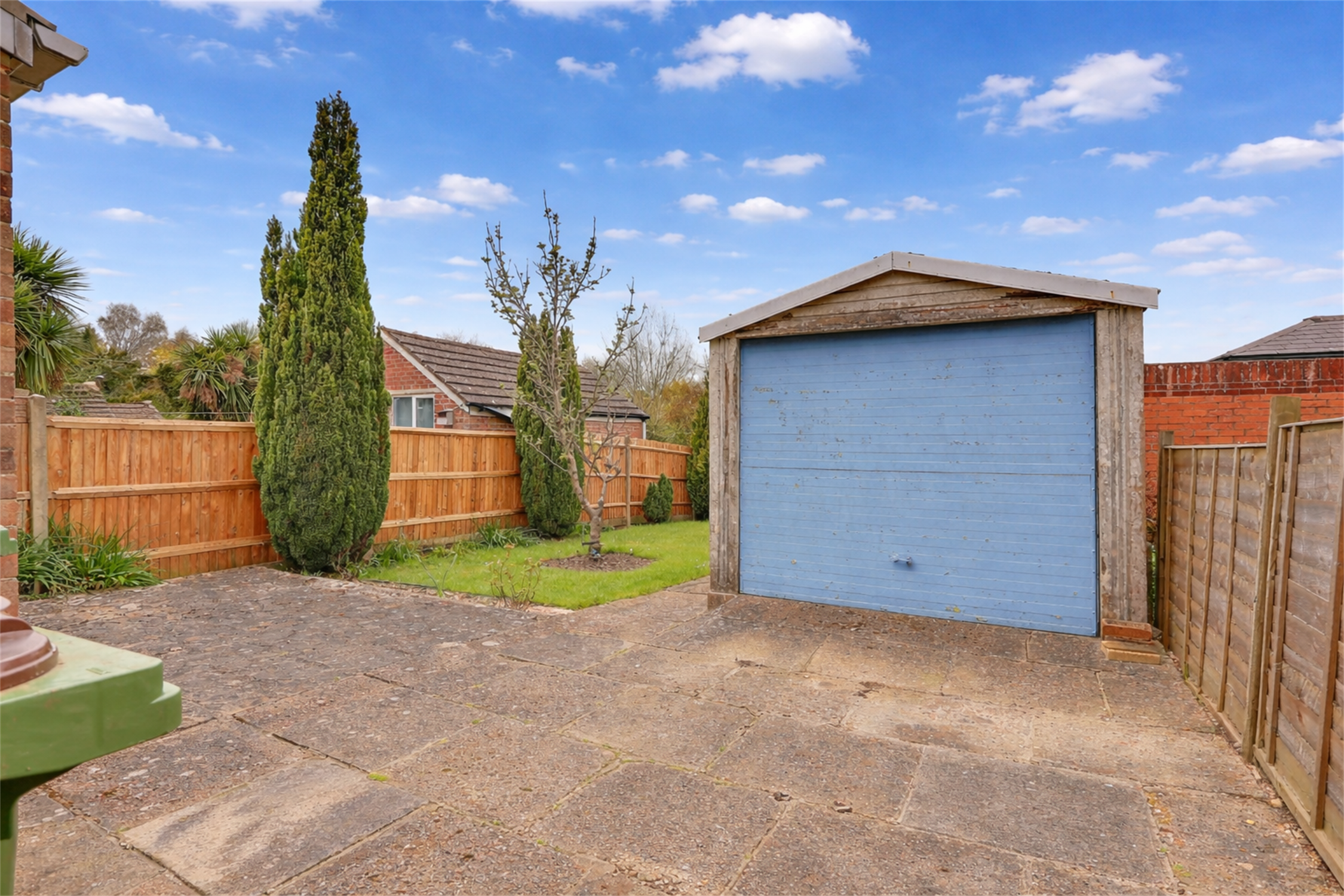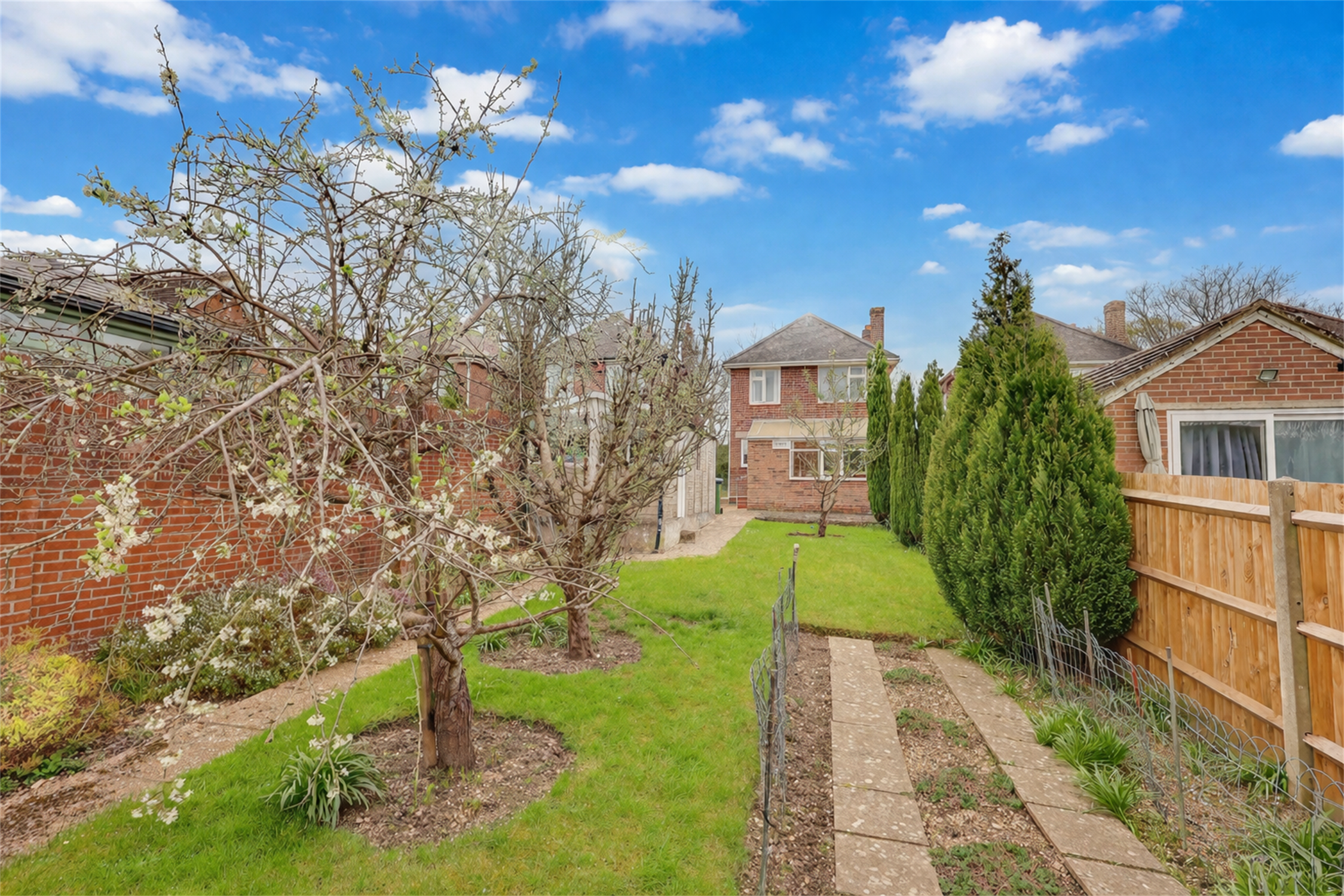 The garden is a true highlight, backing directly onto woodland and offering a high level of privacy and a peaceful outlook. Mainly laid to lawn, it also features two patio seating areas positioned at either end of the garden, making it perfect for outdoor dining and entertaining throughout the day. To the front, the property benefits from a low-maintenance garden, driveway parking and a detached garage measuring approximately 19 feet, providing excellent storage or workshop potential. Although some updating may be required, the property already benefits from gas central heating and double glazing, and is offered with no forward chain.