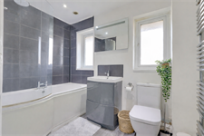 Smooth finish to coved ceiling, extractor fan, two double glazed windows to rear elevation, 'P' shape bath with mains shower over, vanity hand wash basin, low level wc, tiling in applicable areas, towel radiator.