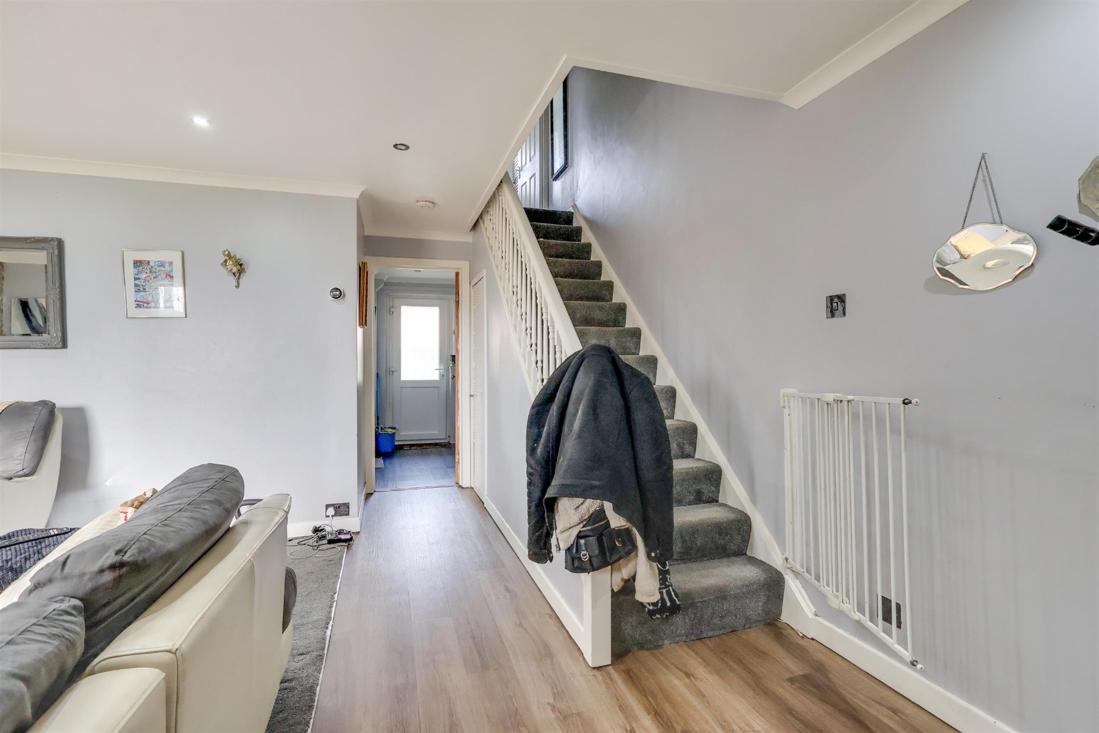Welcome to Portsmouth Road! A beautifully presented three-bedroom end-of-terrace home offering stylish living, practical space, and a superb location ideal for modern lifestyles and commuters alike. Perfectly positioned with excellent access to the motorway network, this attractive home combines convenience with comfort, making it an excellent choice for professionals, families, or investors. Upon arrival, a welcoming entrance porch provides a practical space for coats and shoes before leading into a spacious and inviting lounge. This bright living area benefits from a fitted storage cupboard and offers the perfect setting for relaxing or entertaining. To the rear of the property, the home opens into a contemporary kitchen-diner, thoughtfully designed with sleek high-gloss cabinetry, a gas hob and ample space for a dining table and chairs—creating an ideal hub for family meals and social gatherings. A separate utility room sits conveniently alongside, providing additional storage and keeping household tasks neatly tucked away. Upstairs, the property offers three well-proportioned bedrooms. The landing also provides access to a fully boarded loft, offering excellent additional storage or expansion potential. Completing the first floor is a stylish three-piece family bathroom, featuring a modern P-shaped bath with shower, vanity wash basin, and a contemporary feature towel radiator.