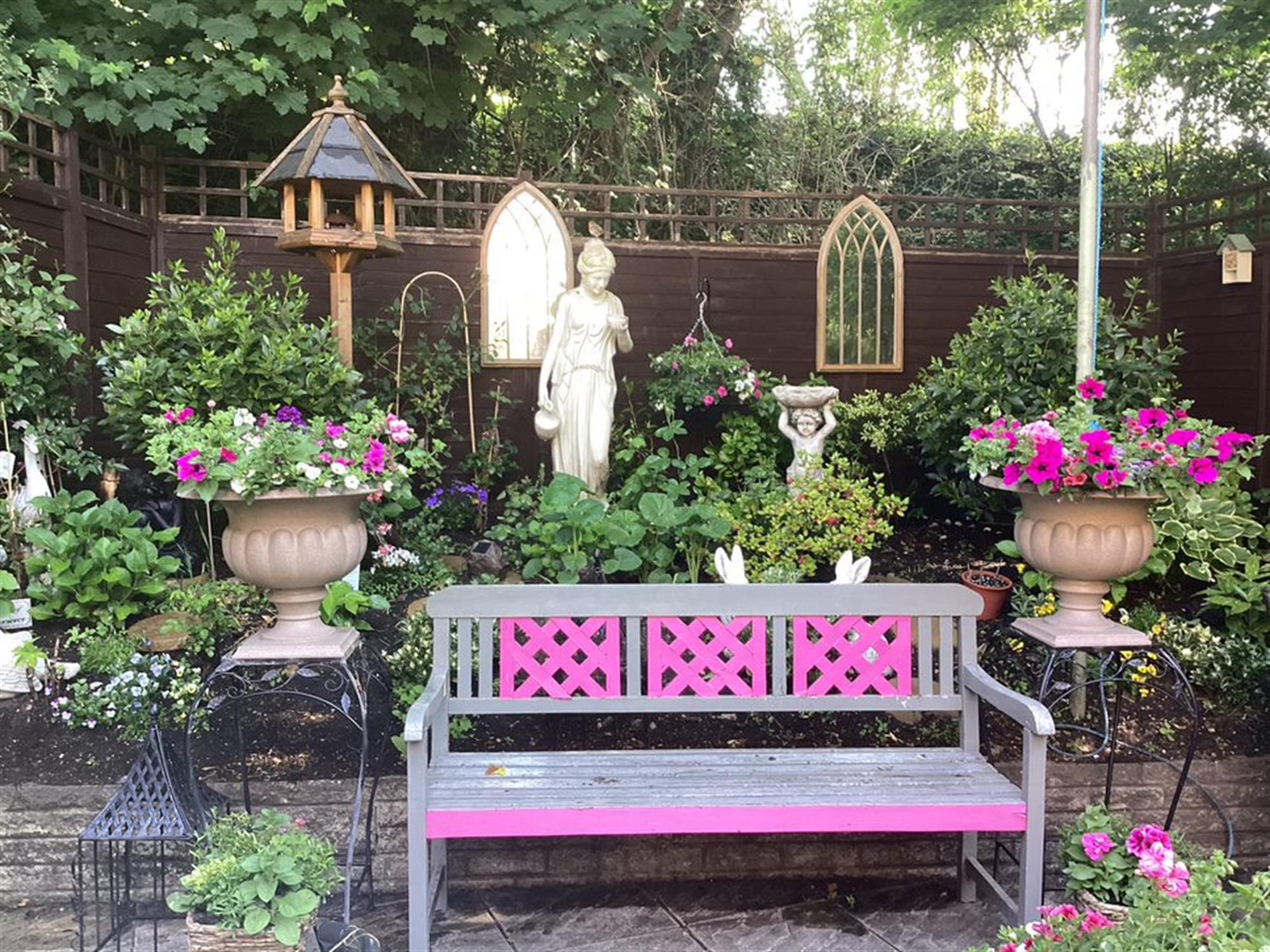 Enclosed garden with mature shrub borders, tiered patio seating areas, shed with power, side access.