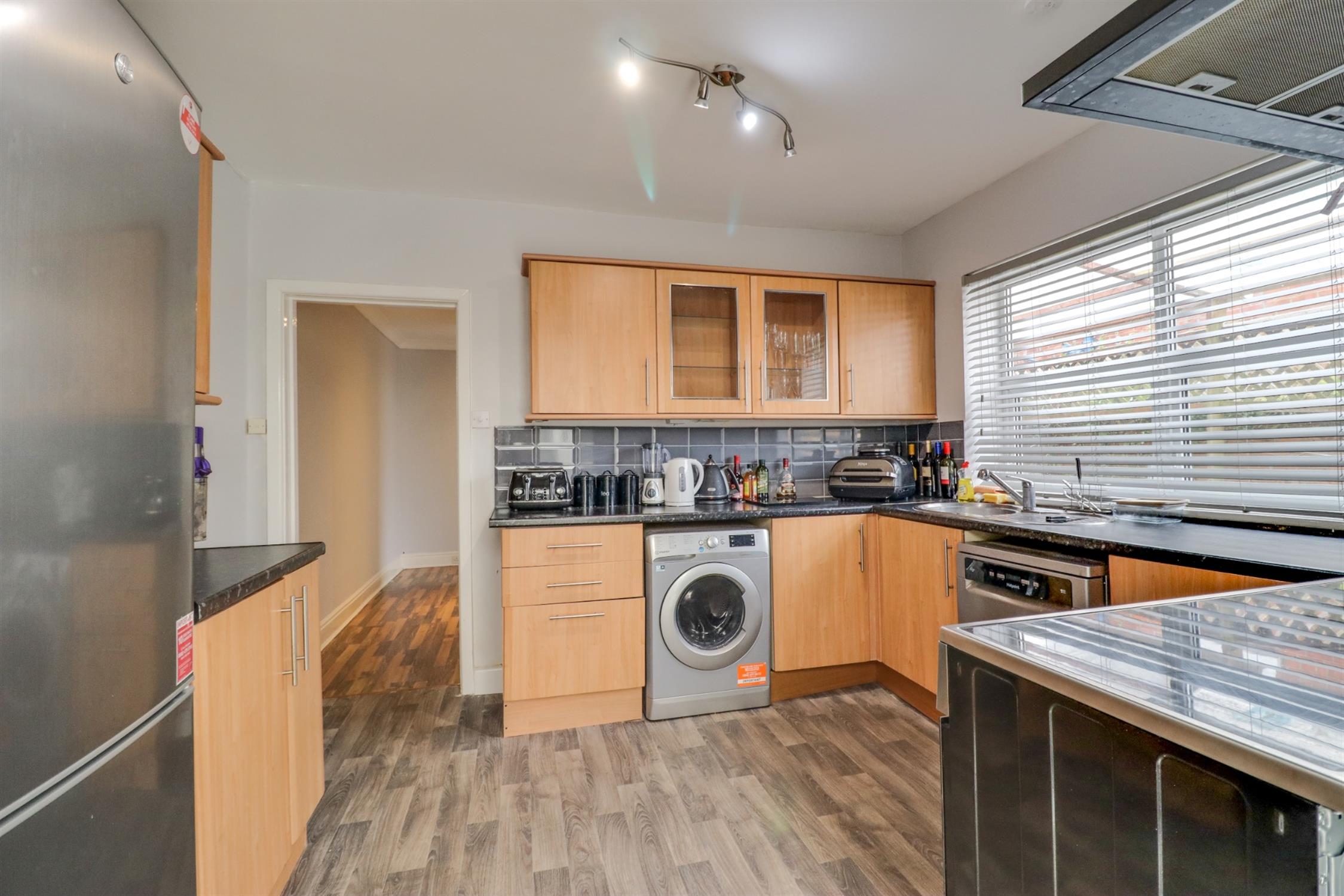 Smooth finish to ceiling with inset spotlights, UPVC double glazed window to side elevation, plumbing for washing machine, space for fridge freezer, washing machine and tumble dryer, low level WC and vanity hand wash basin.