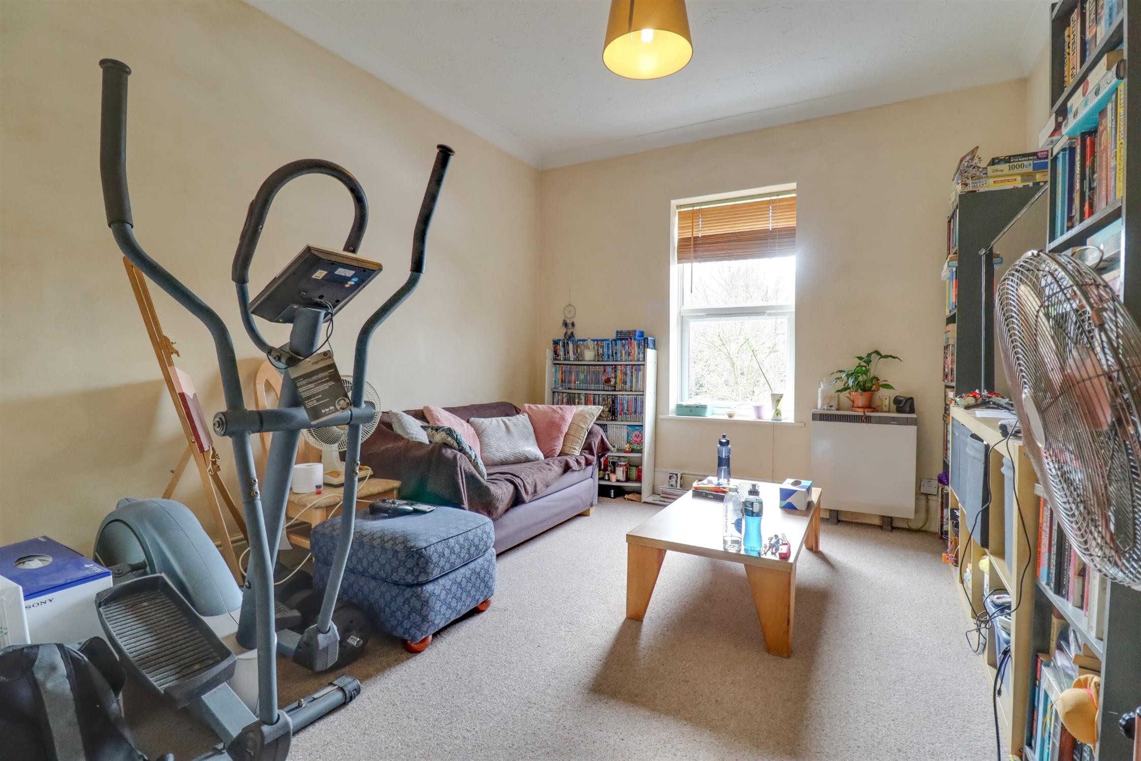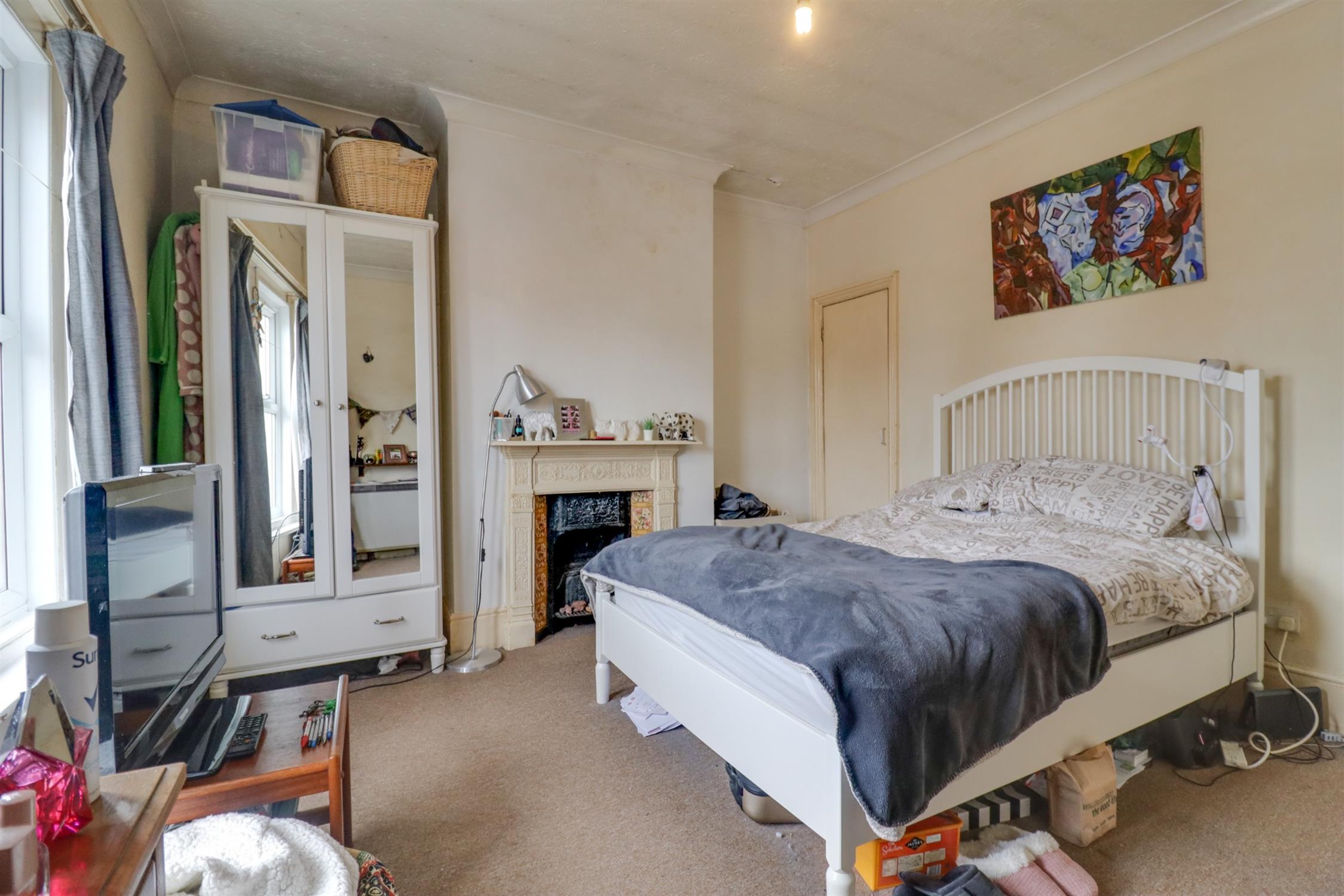 Textured finish to coved ceiling, two double glazed windows to front elevation, original fireplace, built in wardrobe, electric radiator.