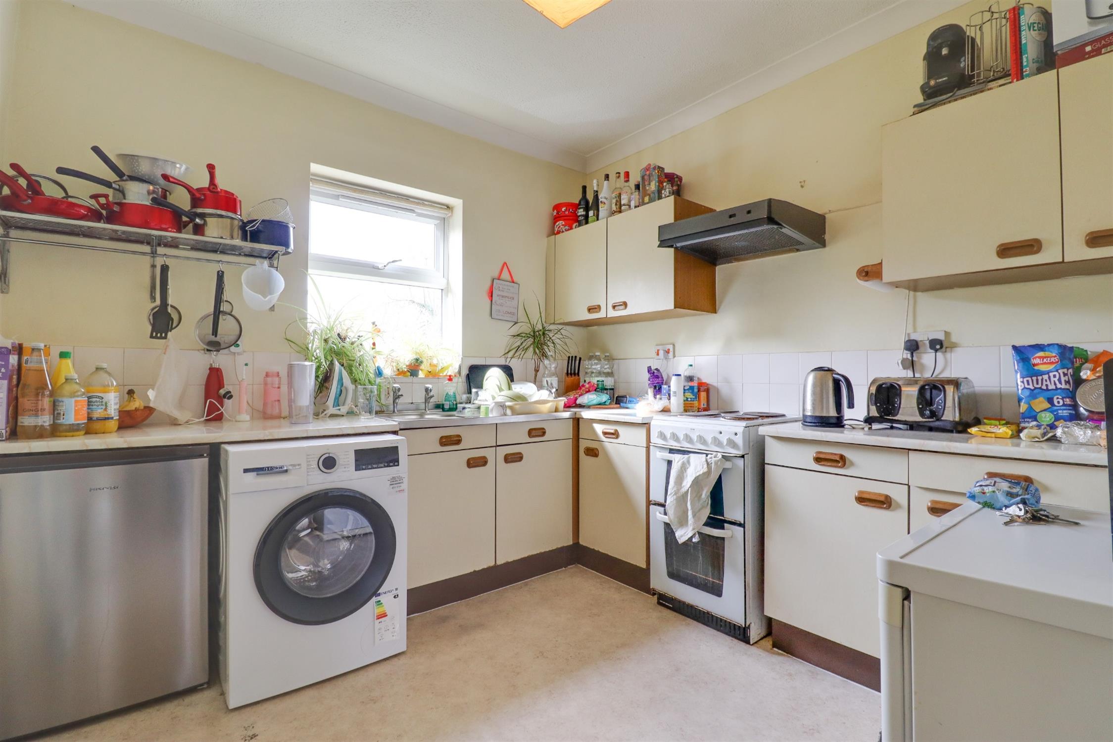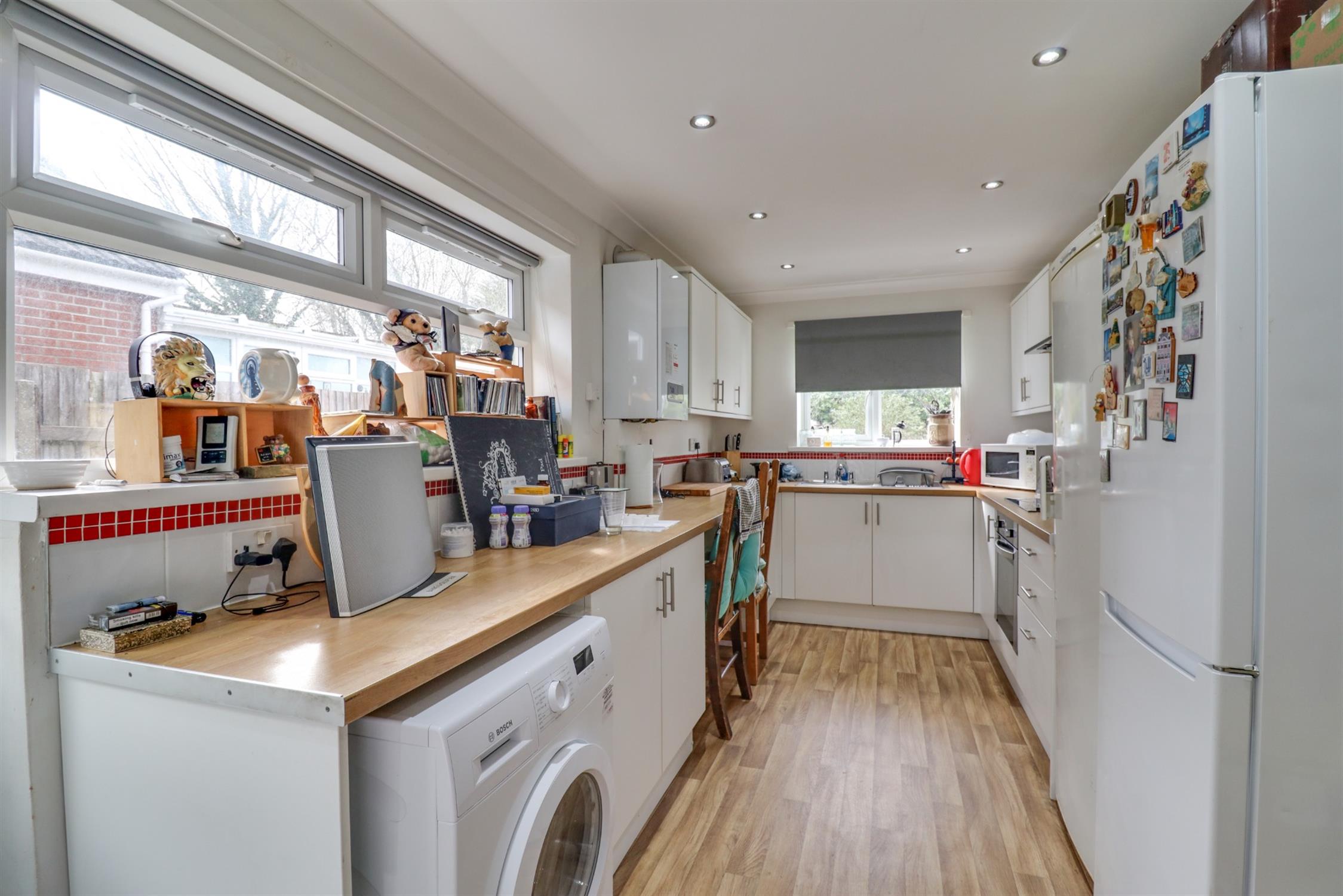 Smooth finish to coved ceiling, inset spotlights, double glazed windows to side and rear elevation, double glazed door to side elevation, range of matching wall and base units with rolltop work surface over, sink and drainer inset, built in cooker and hob with extractor over, space for appliances, tiled splash backs.