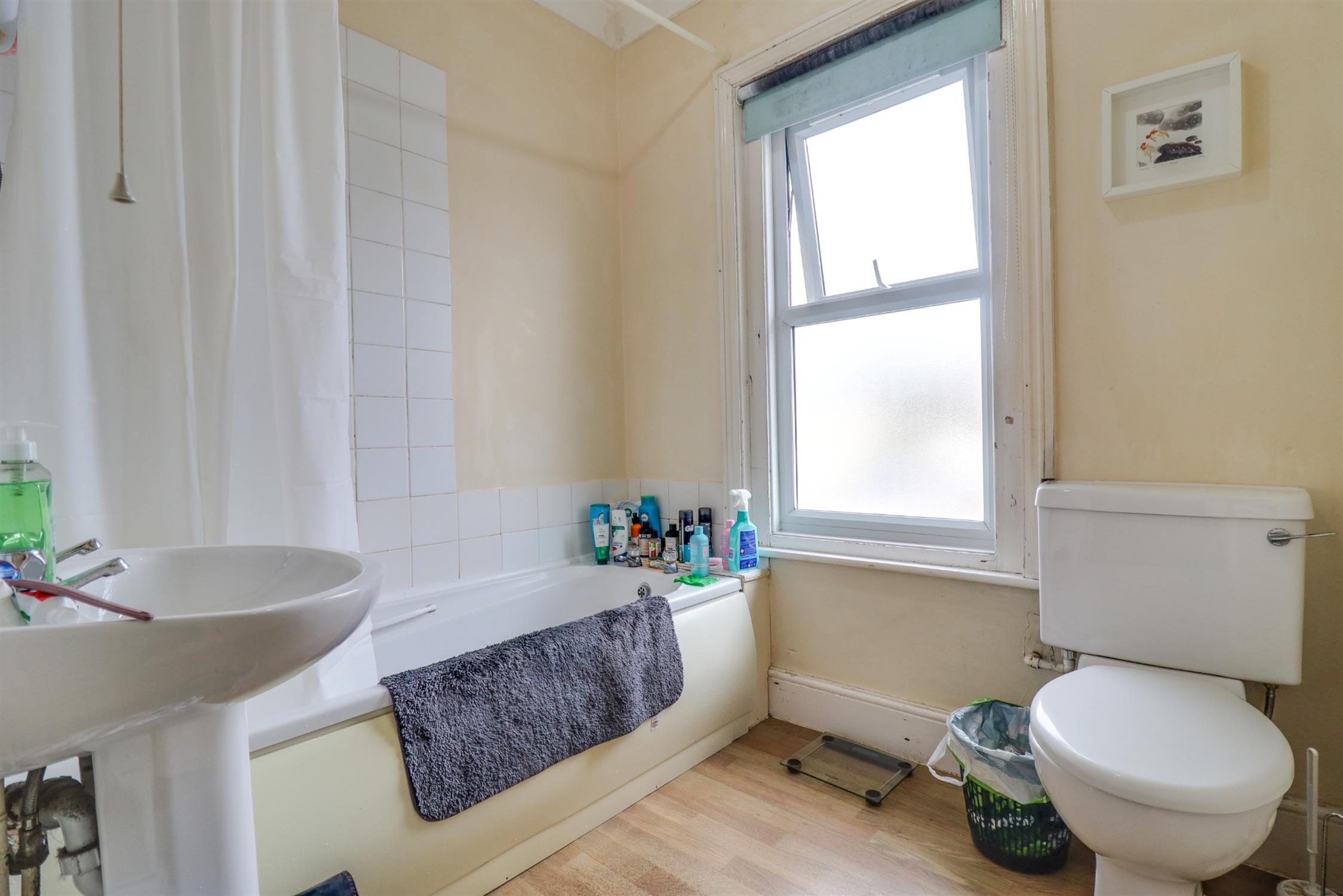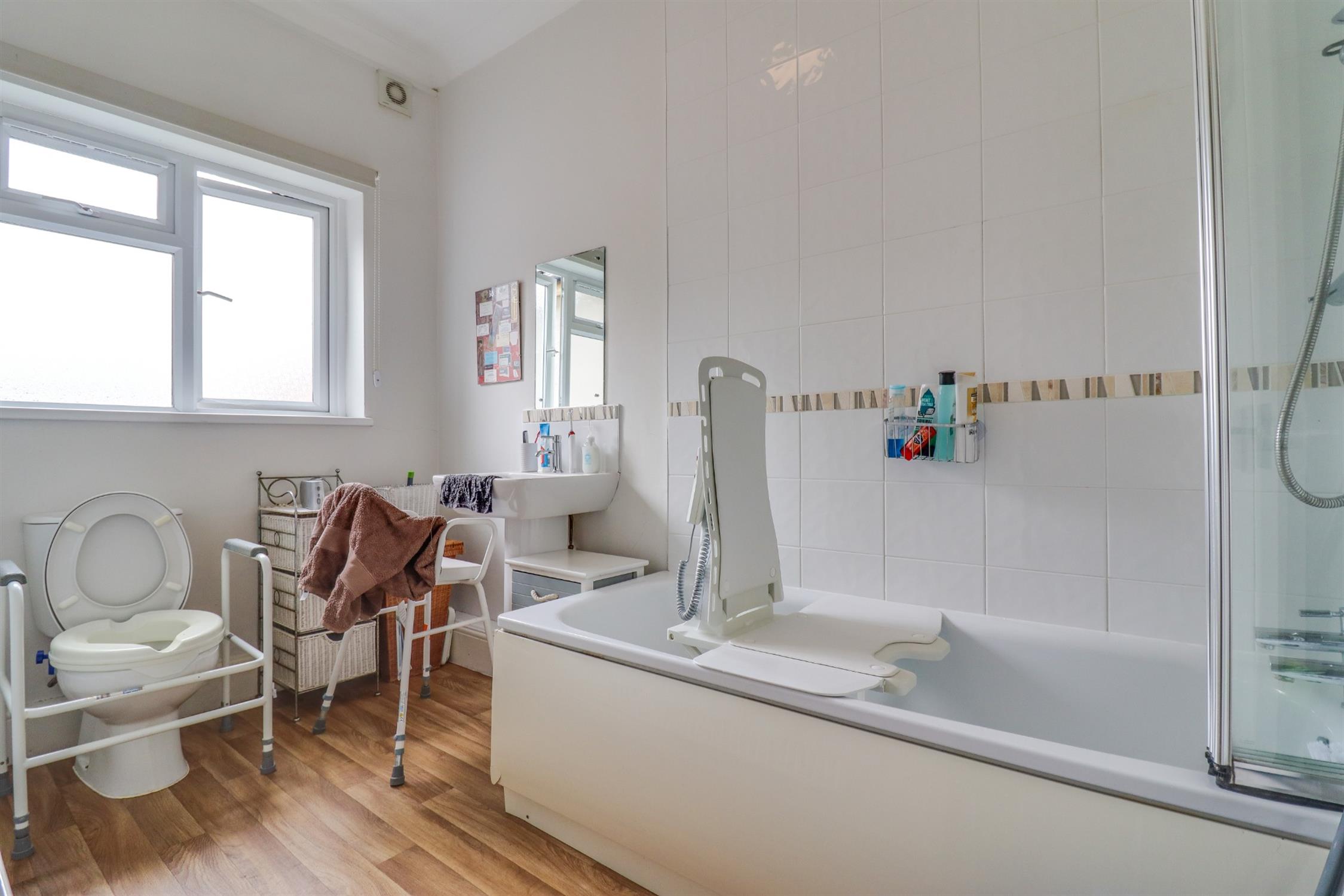 Textured finish to coved ceiling, double glazed window to rear elevation, panel enclosed bath with shower over, low level WC, hand wash basin, tiling in applicable areas, radiator.