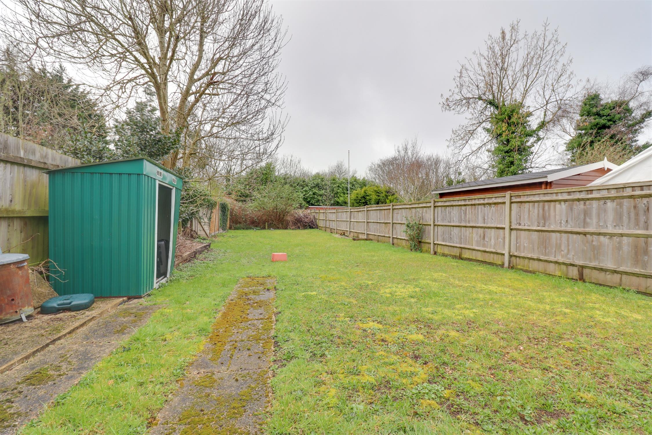 Large southerly aspect garden which is mainly laid to lawn with hard standing area, panel enclosed fencing.