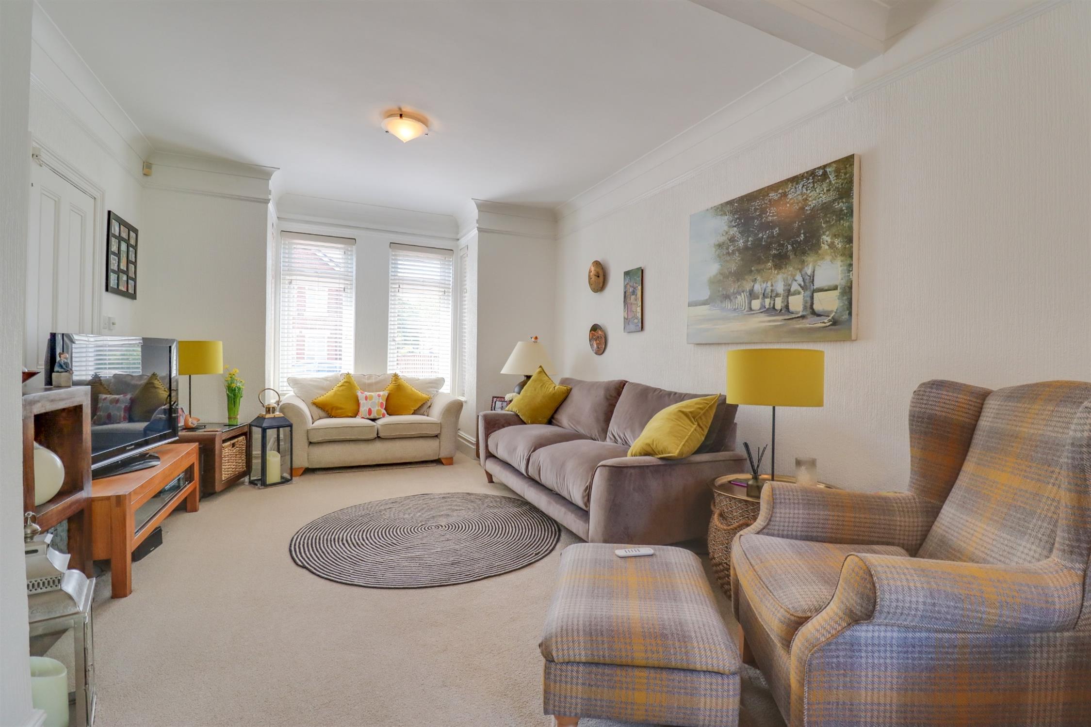 Smooth finish to coved ceiling, picture rails, double glazed bay window to front aspect, double glazed french doors to rear aspect, two radiators.