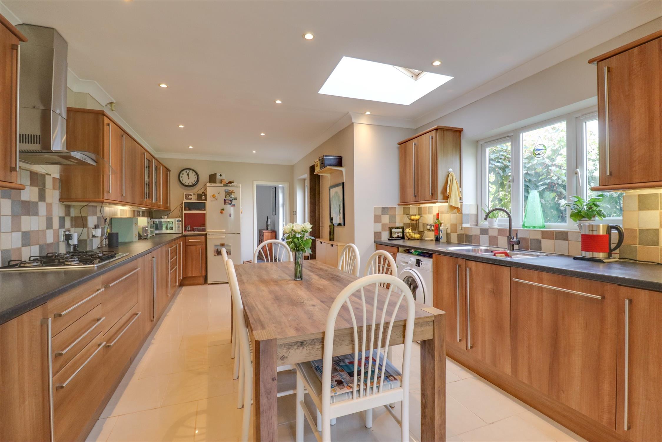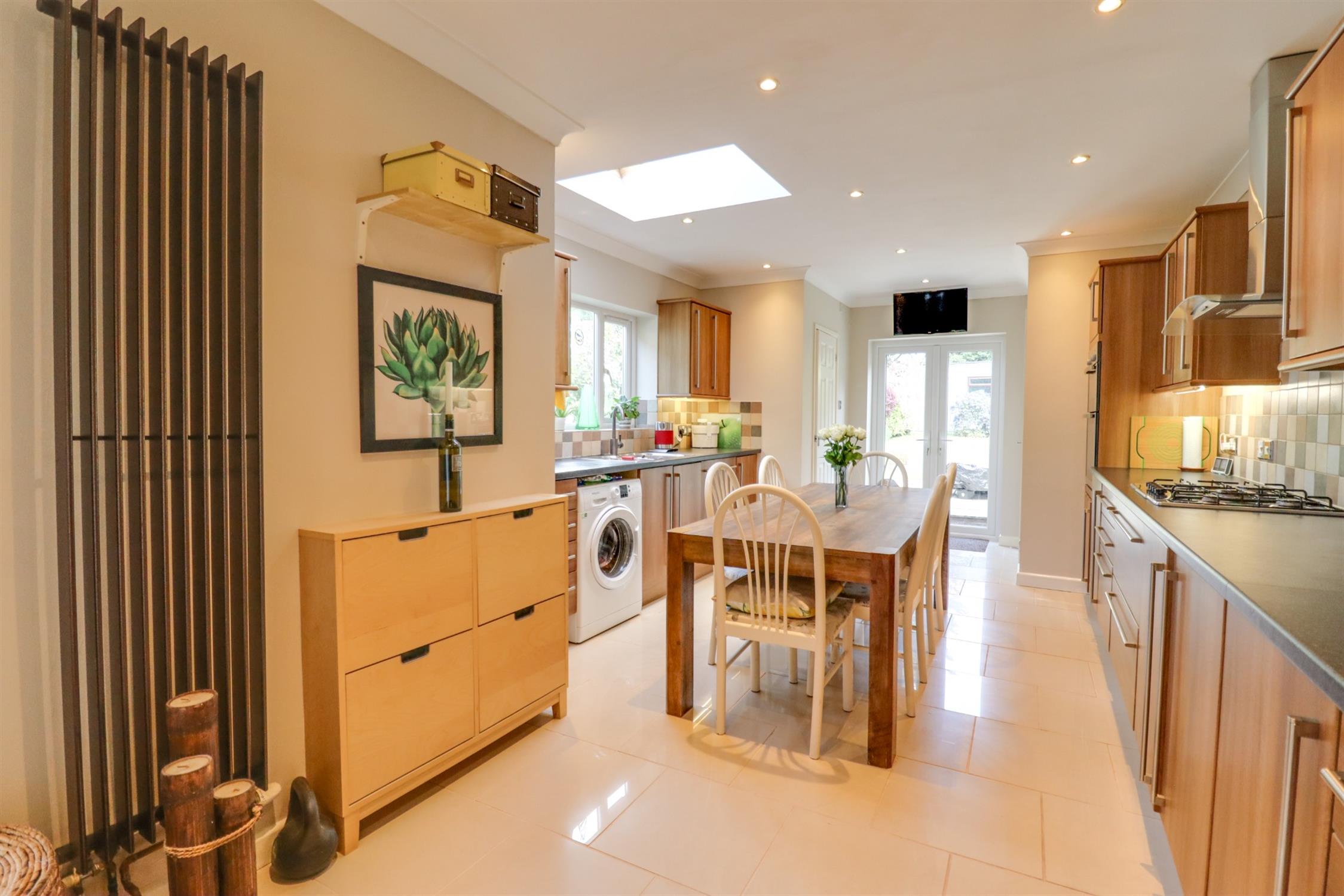 Smooth finish to coved ceiling, inset spotlights, Velux skylight window, double glazed window & door to side aspect, double glazed French doors to rear aspect, a range of matching wall & base units with rolltop work surface over, inset sink & drainer, built in double over, 5 ring gas hob with extractor fan over, tiled splashbacks, radiator, space for washing machine, fridge/freezer & dishwasher & larder cupboard.