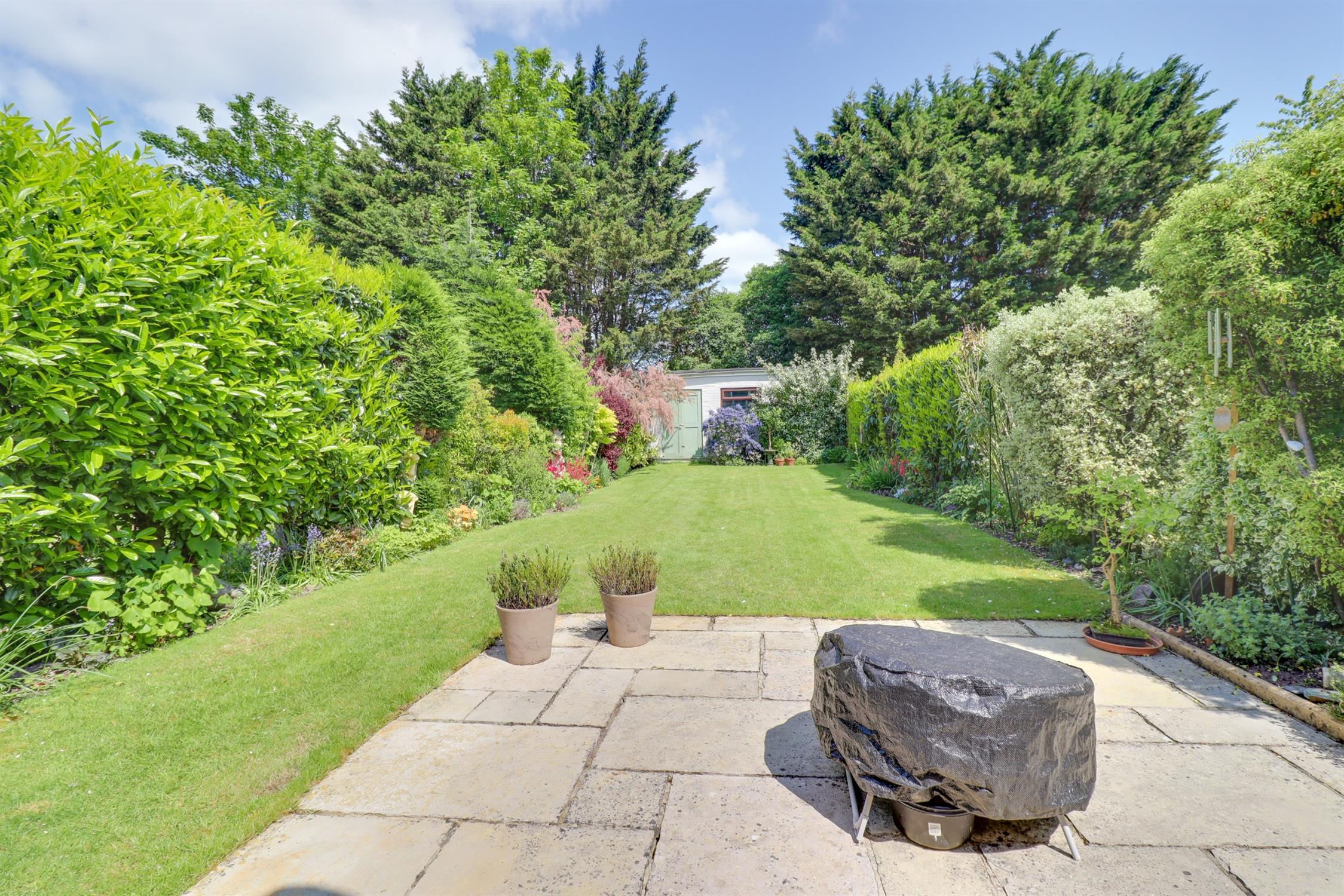 Mainly laid to lawn with a manicured hedge border. There is a slab stone seating area which offers ample room for outdoor furniture and a generous outbuilding which could be used for multiple purposes including a work shop or even a home bar.