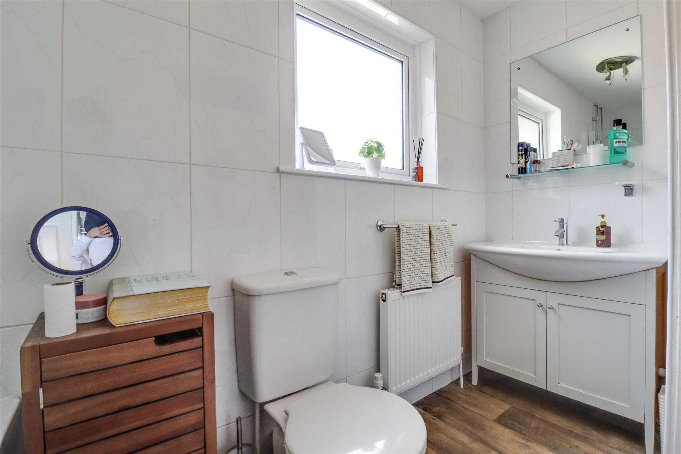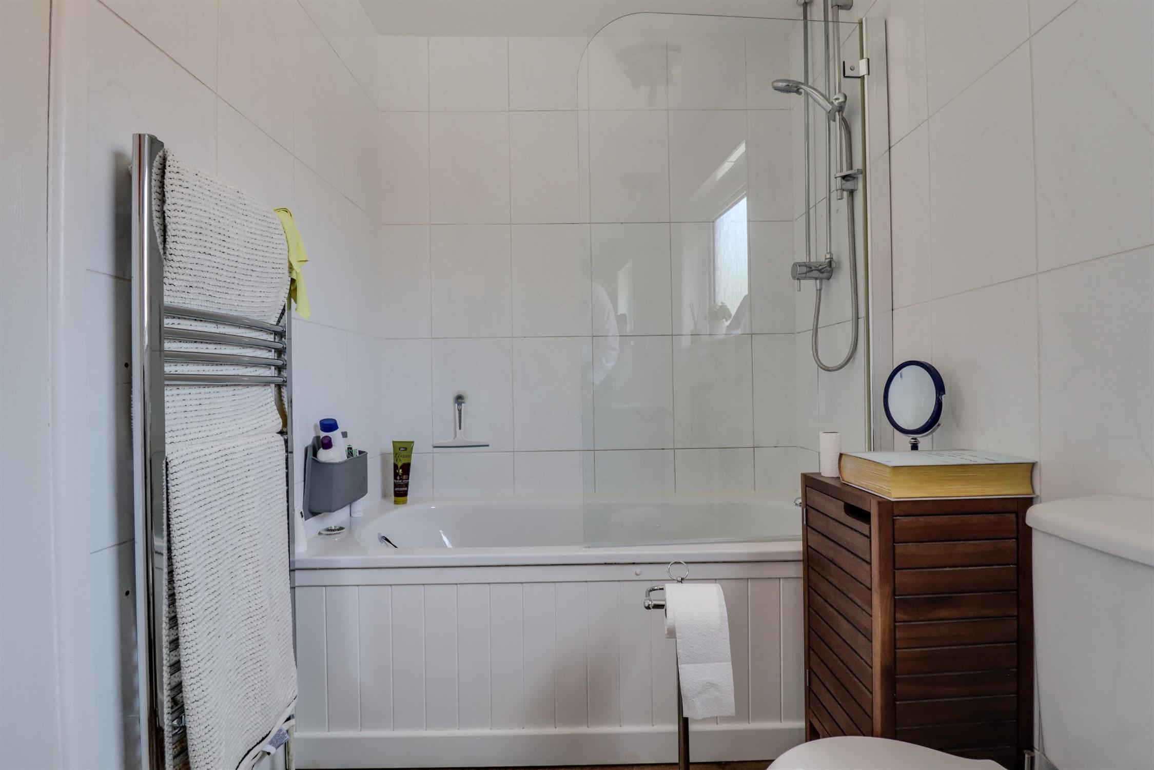 Smooth finish to coved ceiling, double glazed window to side aspect, airing cupboard housing a combination boiler & radiator, panel enclosed bath with shower over, low level wc & hand wash basin, tiling in applicable areas, heated towel radiator.