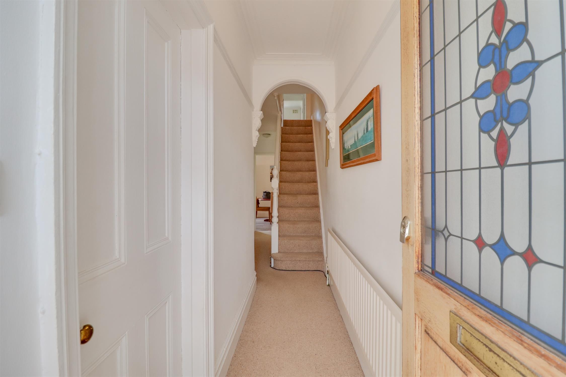 Smooth finish to ceiling, original coving, door to front aspect, radiator, stairs rising to first floor with storage cupboard under, door to: