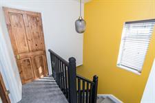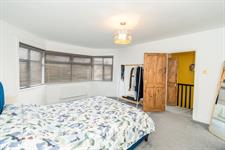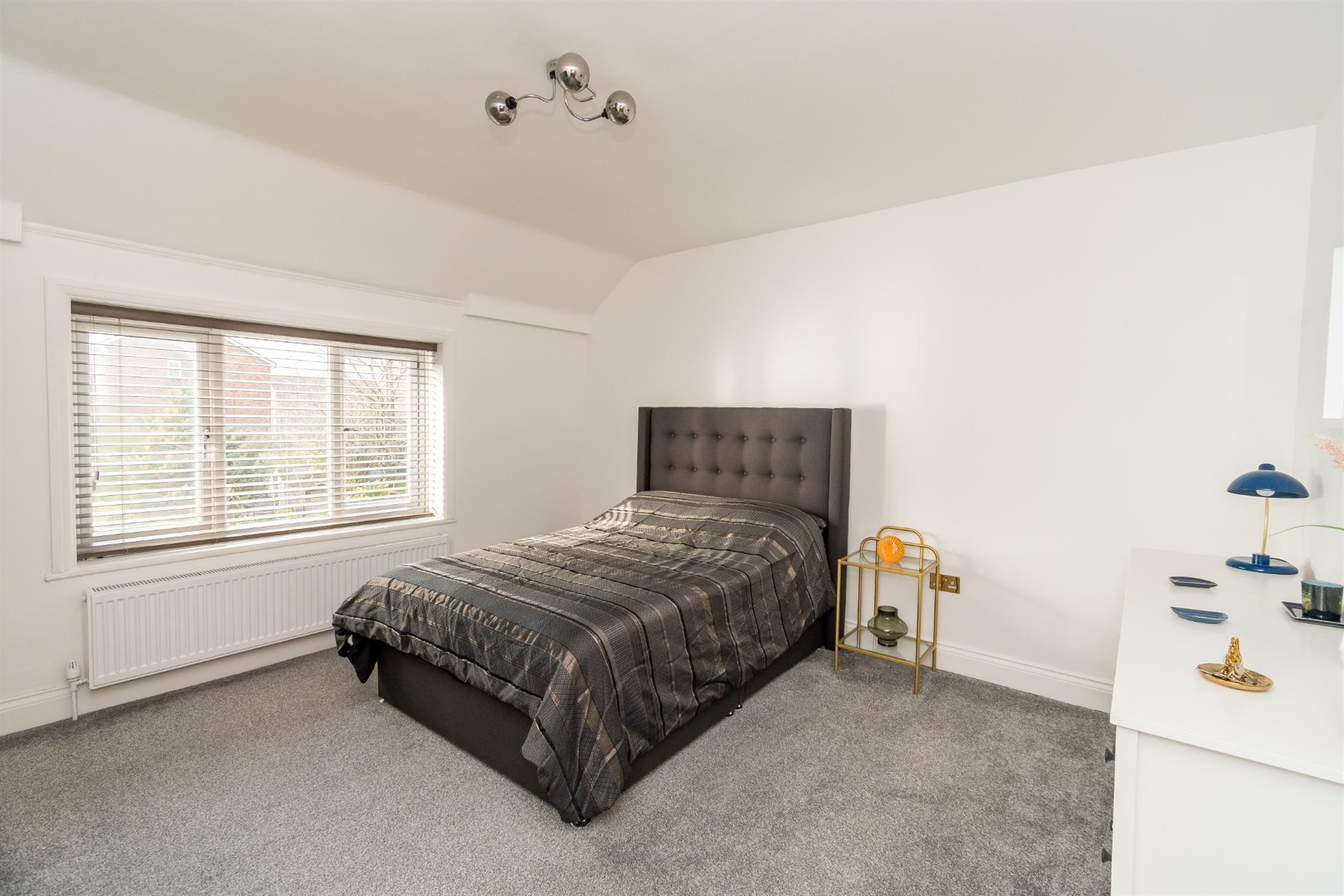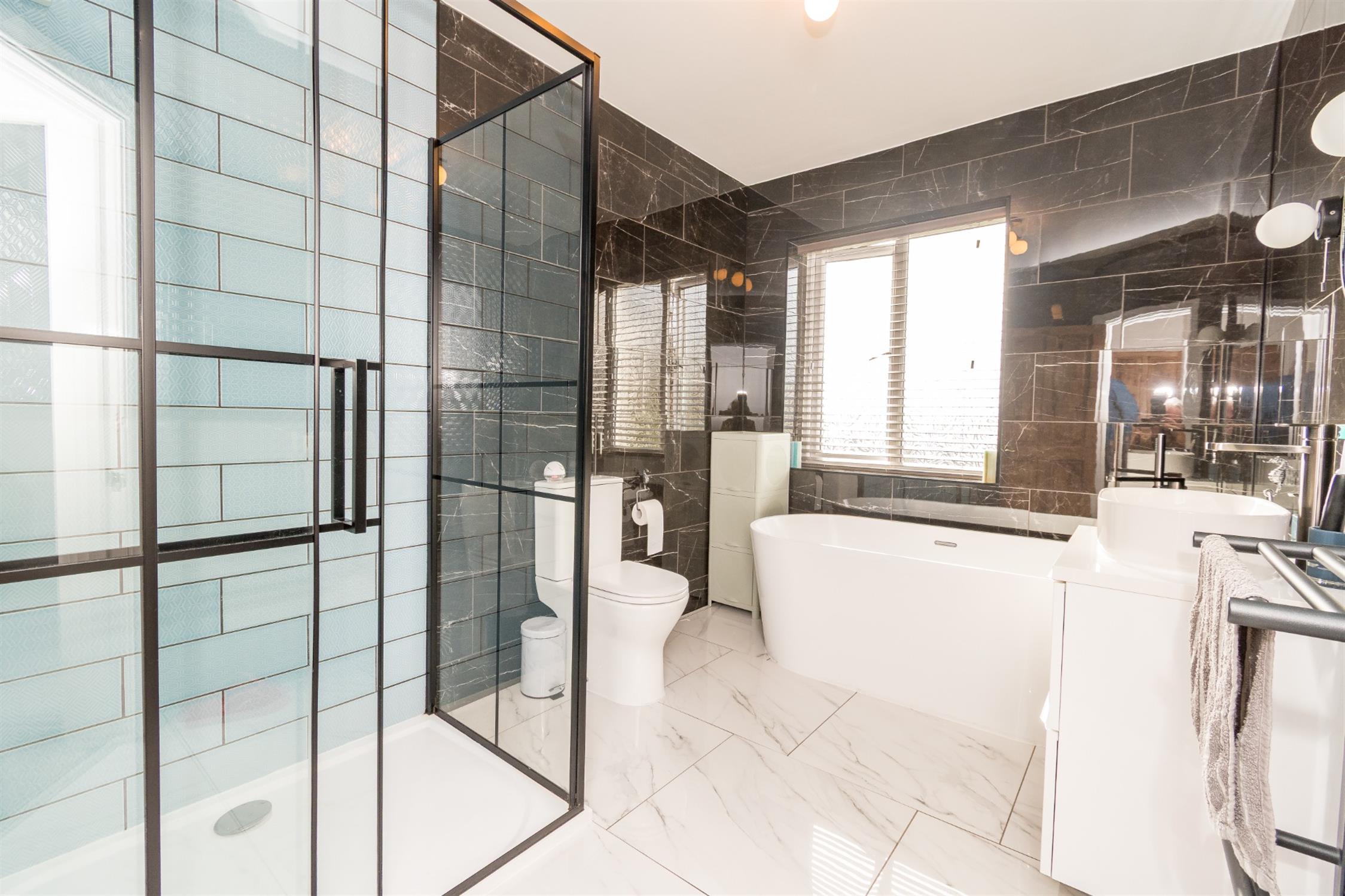 Upstairs, the property boasts two generously sized double bedrooms and a stunning family bathroom. The principal bedroom, located at the front, features another large bay window and comfortably accommodates a king-size bed along with multiple wardrobes. The second bedroom is equally spacious, also suitable for a king-size bed, and enjoys views over the rear garden. The luxurious four-piece family bathroom includes a walk-in shower, free standing bathtub, hand basin, and WC, all complemented by elegant black marble-effect tiling.