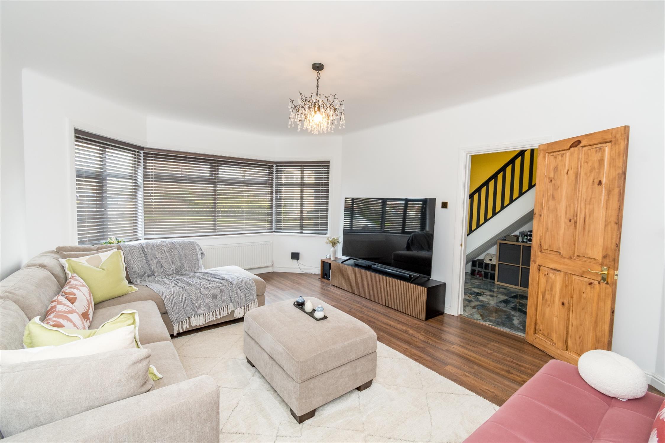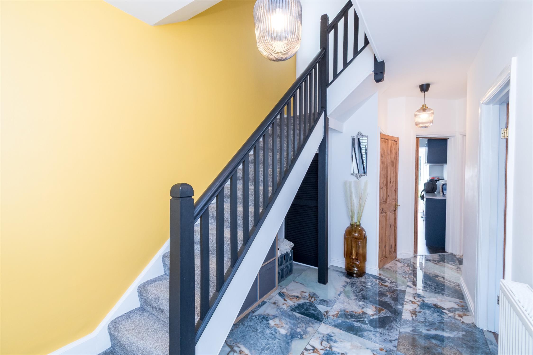 Upon entering, you are welcomed by a useful entrance porch—ideal for coats and shoes—leading into a bright hallway featuring striking marble-effect flooring, setting the tone for the quality found throughout the home. The spacious lounge is positioned at the front of the property and benefits from a large bay window, allowing an abundance of natural light to fill the room. A separate dining room provides ample space for a large dining table, making it perfect for entertaining or family meals.