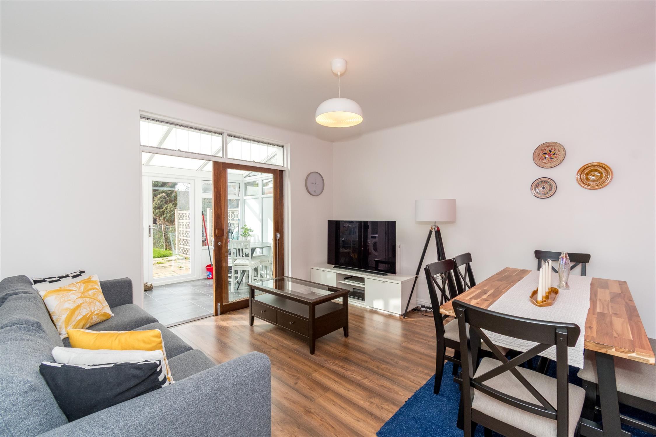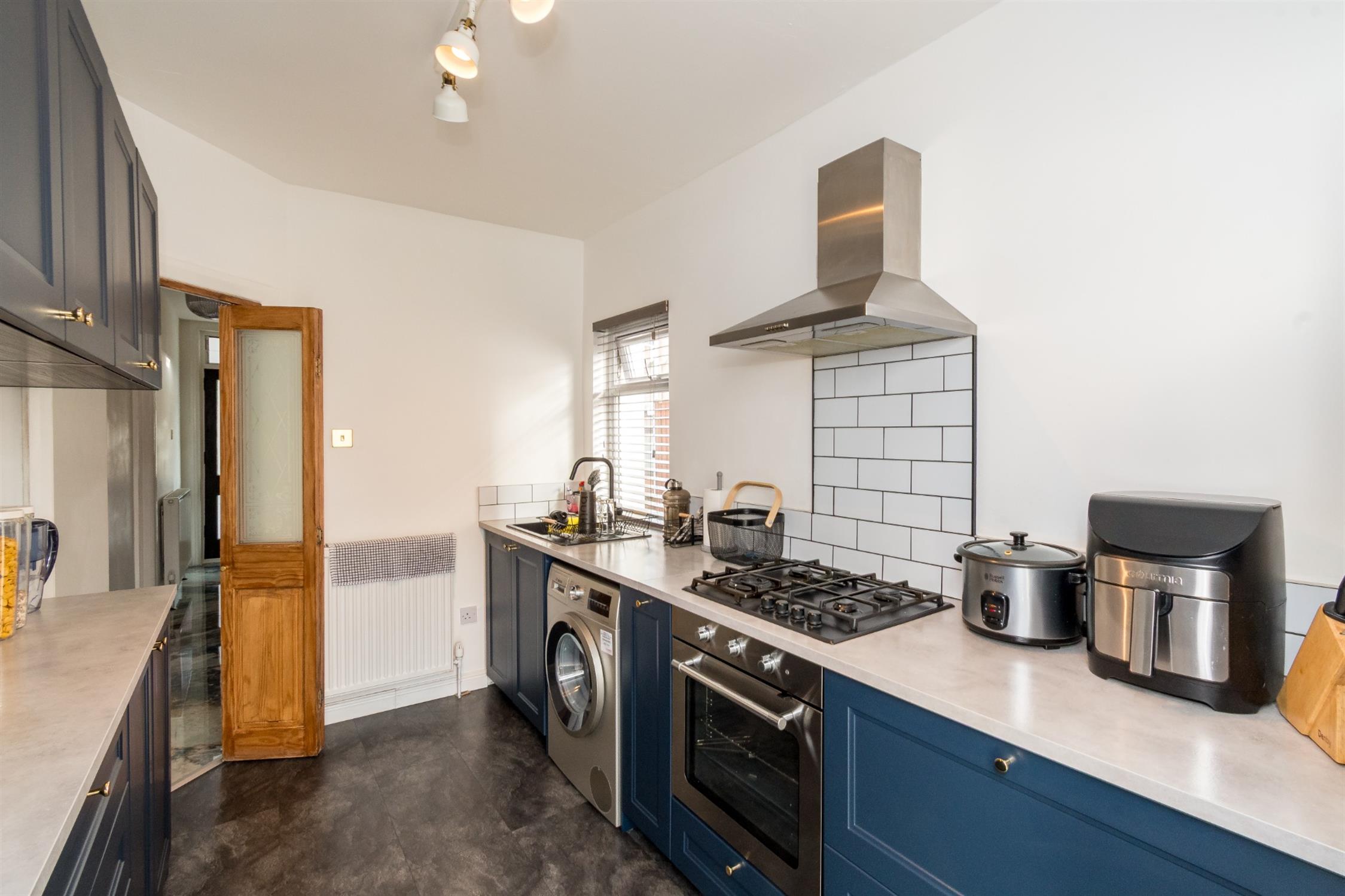 Flowing from the dining room is a versatile conservatory, offering additional living space that can be used as a sitting room, playroom, or even a utility area. The kitchen is finished in a stylish navy blue design with contrasting worktops and offers plenty of space for appliances, combining both functionality and contemporary appeal.
