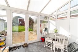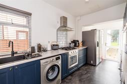 Flowing from the dining room is a versatile conservatory, offering additional living space that can be used as a sitting room, playroom, or even a utility area. The kitchen is finished in a stylish navy blue design with contrasting worktops and offers plenty of space for appliances, combining both functionality and contemporary appeal.