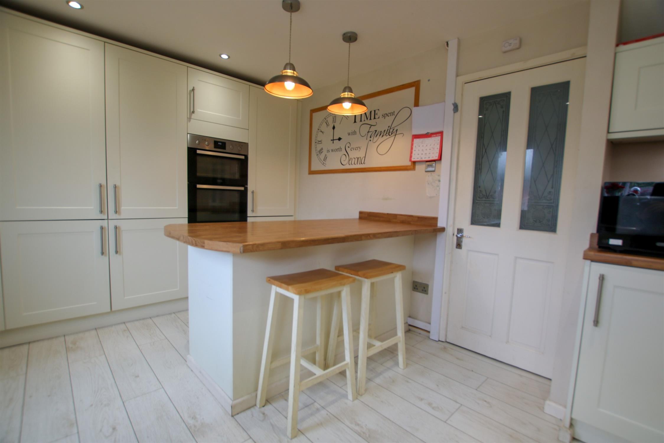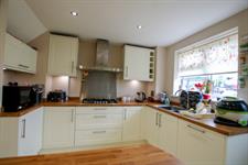 Base and eye level units, insert double sink to counter top, built in gas cooker, extractor hood, electric double oven, fridge, freezer, dishwasher, washing machine, island table, double glazed windows to rear elevation, smooth finish to ceilings with spotlights, door to garden.