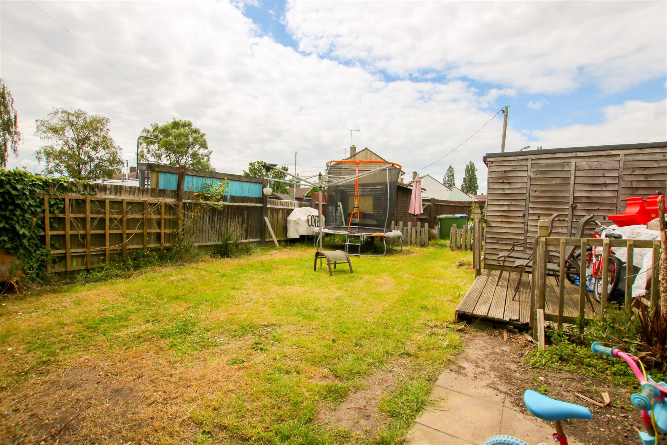 Block paved patio, laid to lawn with side flower beds, shed and gate at rear for rear access and parking.