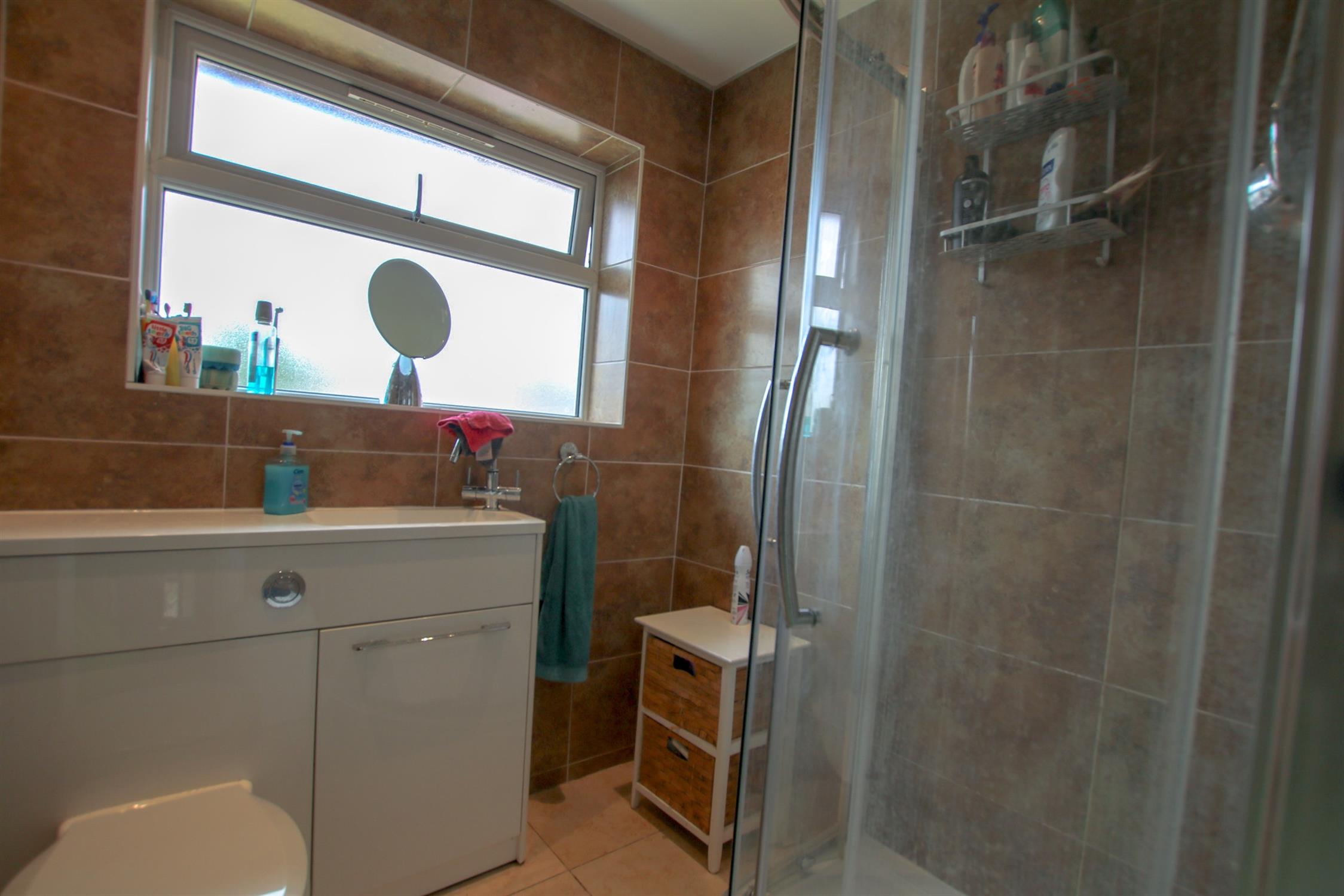 Double glazed window rear elevation, tiled floor to ceiling, three piece shower suite with built-in storage unit, heated towel rail, smooth finish to ceiling with spotlights and inset extractor fan.