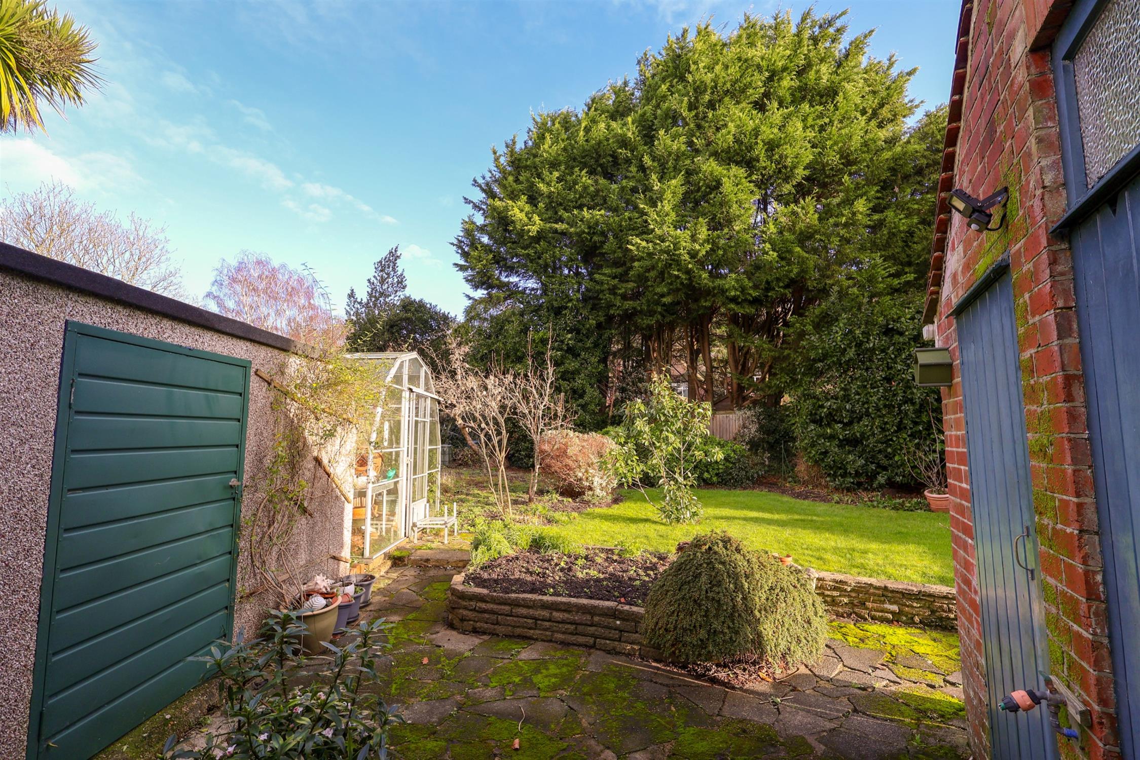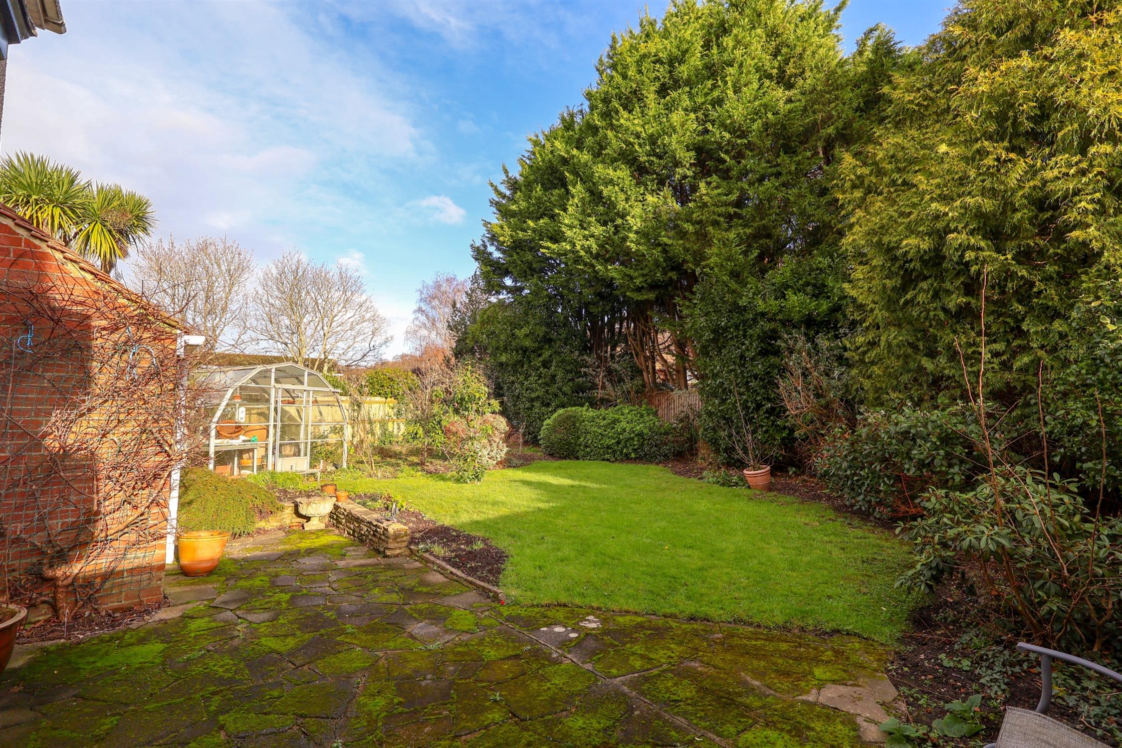Doors to external WC and storage cupboard, block paved patio area, laid to lawn with surrounding flowerbeds, trees and shrubbery, side door to garage.