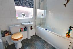 UPVC double glazed obscured window to side, three-piece suite comprising: WC, wash hand basin, panel enclosed bath with mains fed shower over and extractor, tiling to principal areas heated ladder towel rail.