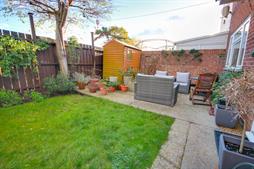 Wall and fence enclosed rear garden with gated side access, mainly laid to lawn with hard standing to side, shed.