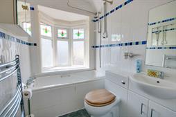 Smooth ceiling, UPVC double glazed display bay window to front, white suite comprising: WC, wash hand basin and bath, heated ladder towel rail, fully tiled walls.