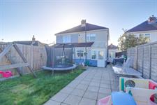 Upstairs, you’ll find two beautifully appointed bedrooms, including a generous 13'5" master bedroom with a feature bay window, along with a modernised three-piece family bathroom. Outside, the rear garden is truly remarkable. An expansive patio area leads onto a large lawn, flowing further to a decked seating area — perfect for al fresco dining and social gatherings. Additional benefits include a front garden with a shingled frontage offering potential for off-road parking for two cars, gas central heating, and double glazing throughout.
