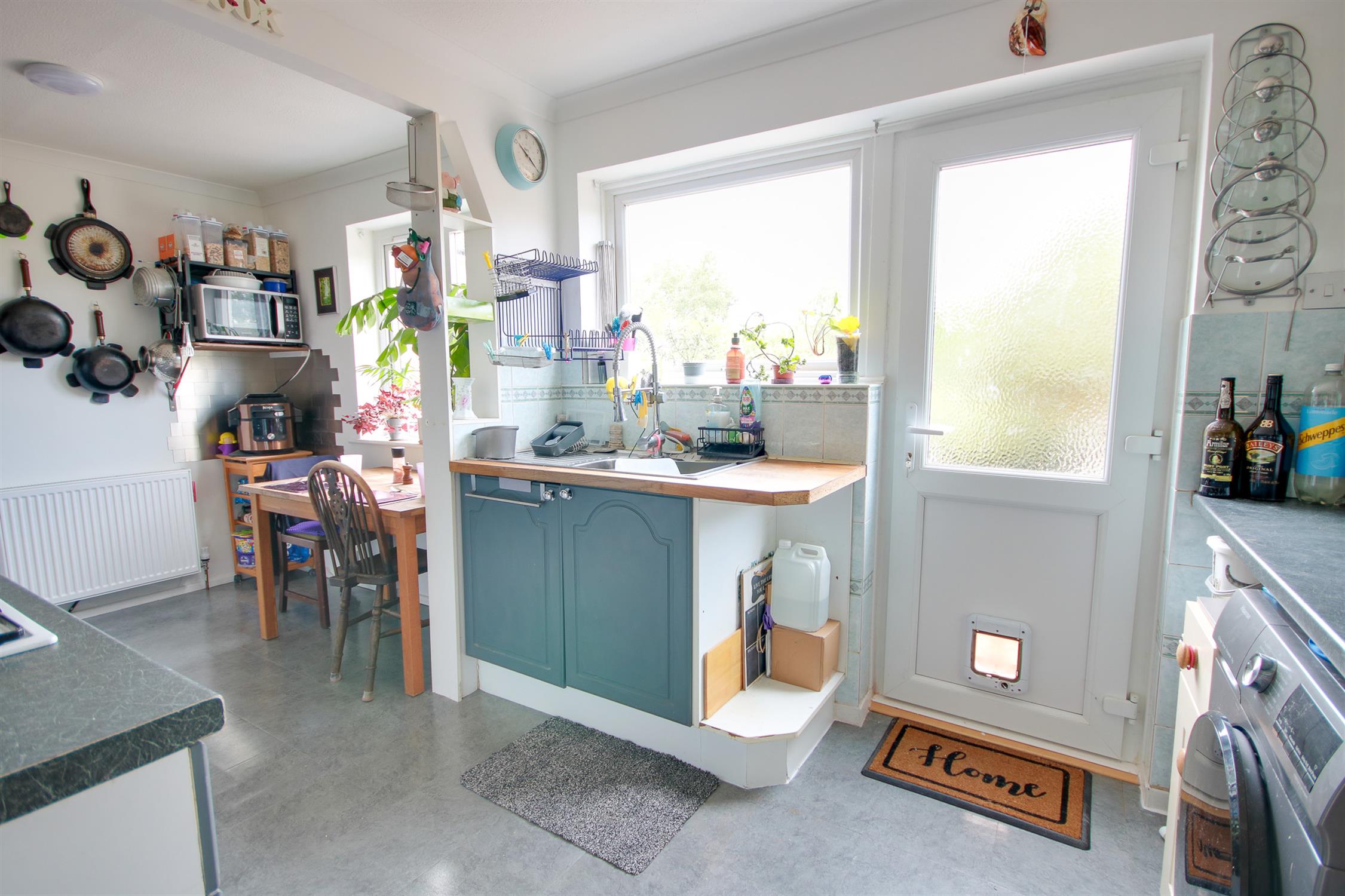 Coved and textured ceiling, two UPVC double glazed windows to rear overlooking garden, wall, base and drawer units with work surface over, stainless steel bowl and a half sink with drainer inset, built-in oven with gas hob over, space for appliances, radiator.
