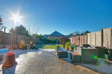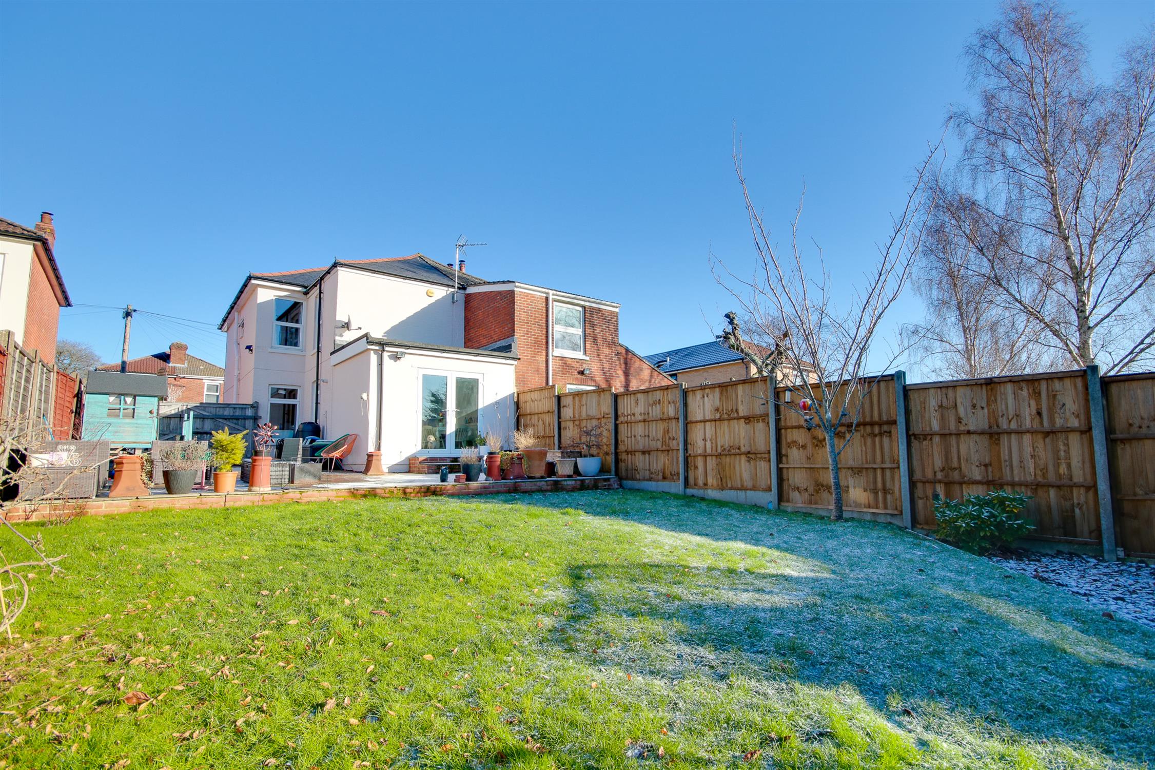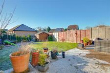 Fence enclosed rear garden with patio seating area, lawn, shed, side access.