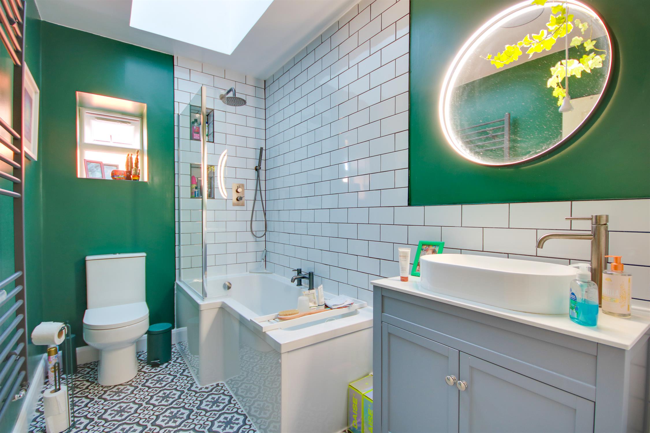 Smooth ceiling, skylight, double glazed obscured window to side, 'P'-shaped bath with shower over, wash hand basin, WC, tiling to principal areas, ladder towel rail.