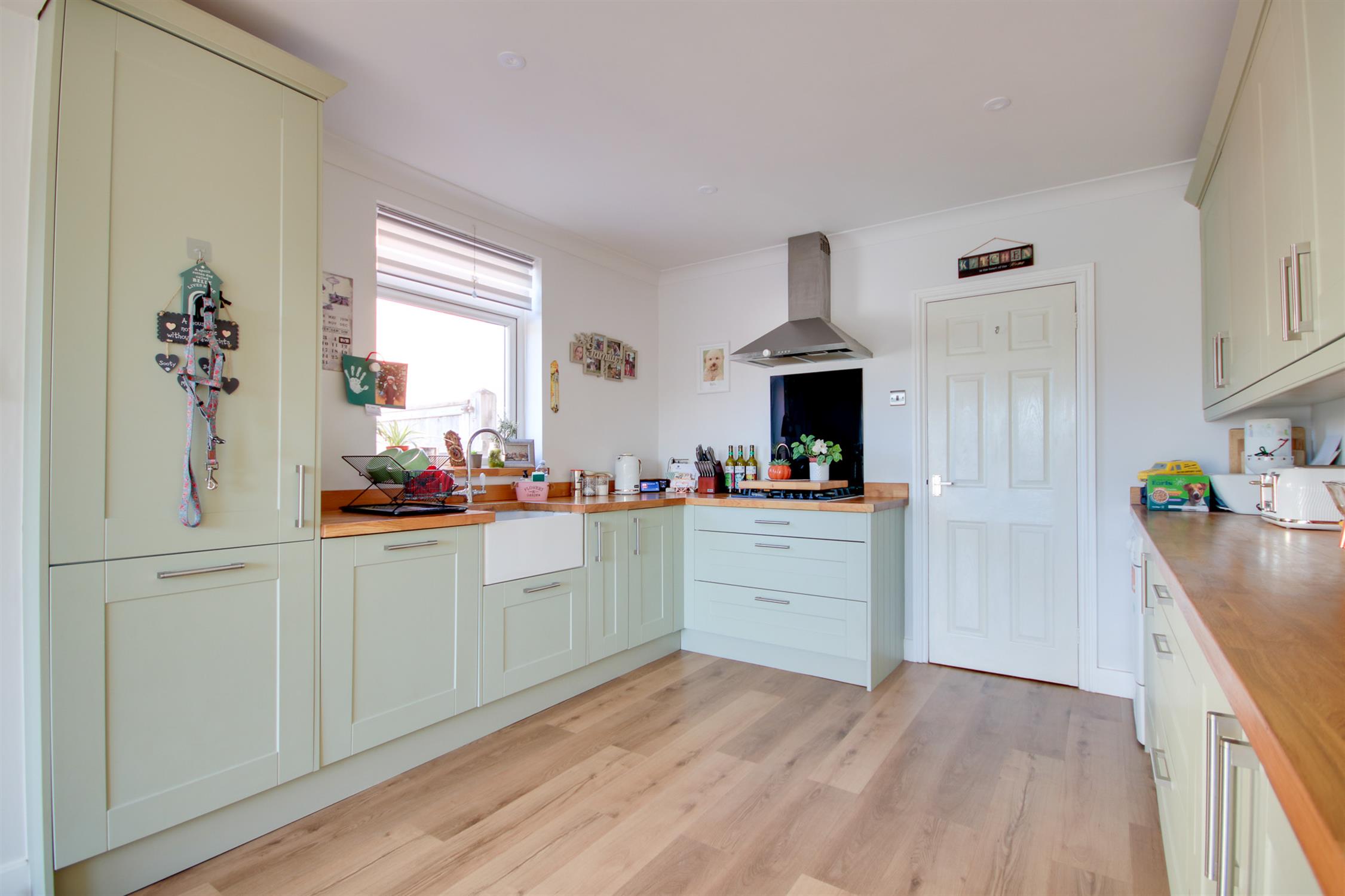 Smooth and coved ceiling, double glazed window to side, double glazed French doors to rear, a range of wall, base and drawer units with work surface over, butler sink, built-in gas hob with extractor over, built-in oven and microwave, built-in dishwasher, space for tumble dryer and fridge/freezer, radiator.