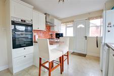 Textured ceiling, double glazed windows to rear and side, door to side, range of wall, base and drawer units with work surface over, breakfast bar, bowl and a half sink and drainer inset, built in gas hob with extractor fan over, built in oven. Space for fridge/freezer, washing machine and slim line dishwasher, cupboard housing boiler, radiator.