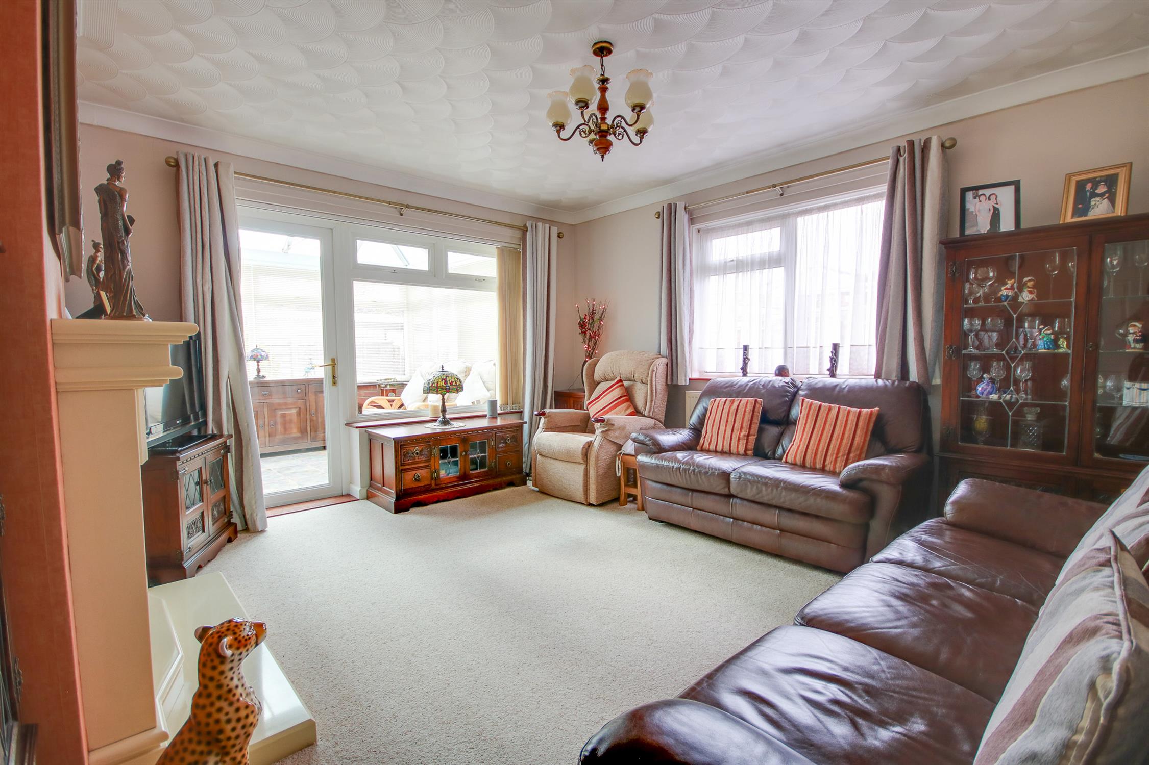 Textured ceiling, double glazed window to side and rear, double glazed door leading in to conservatory, fire place and surround.