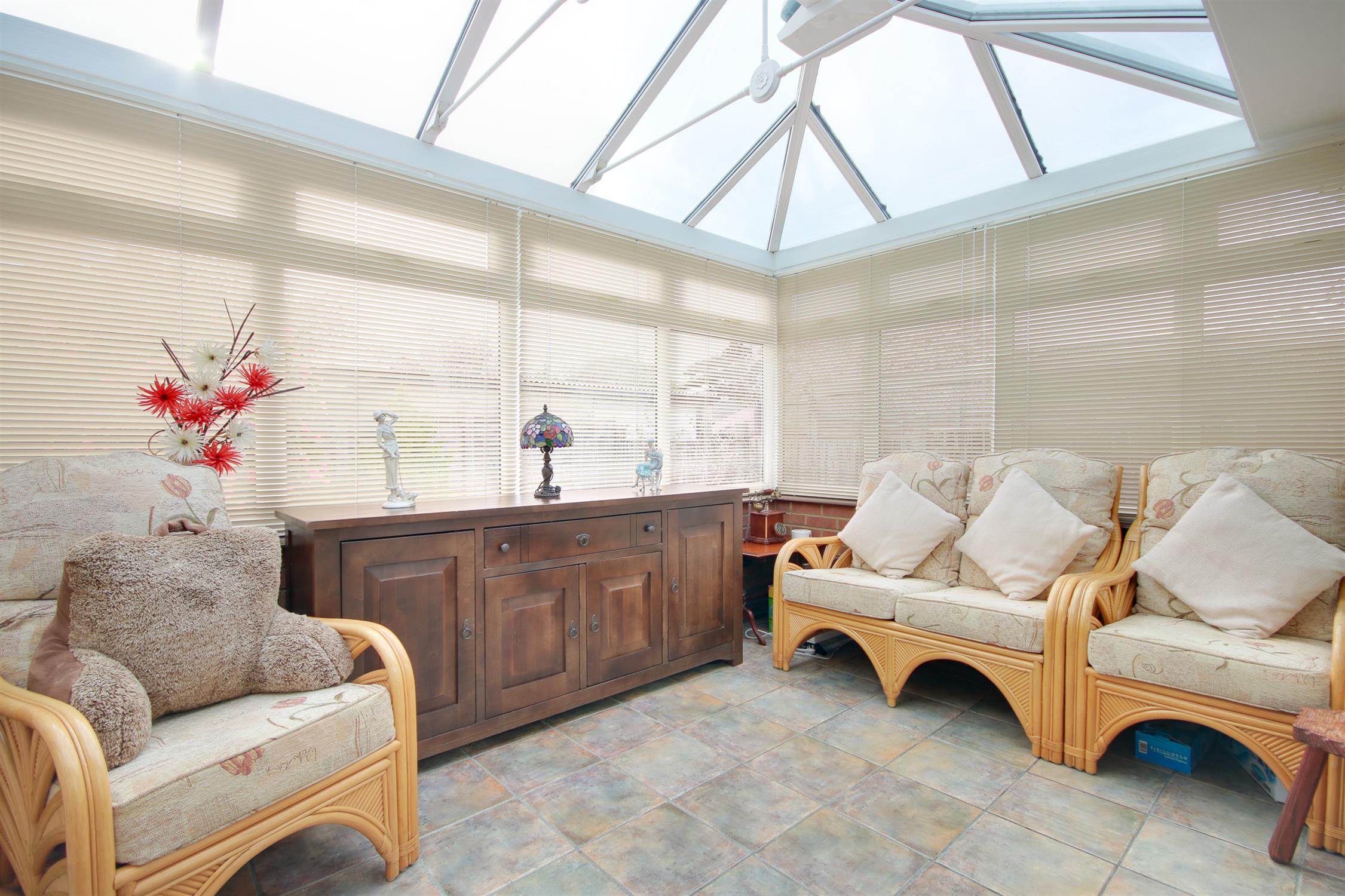 Glass roof, double glazed windows to sides and rear, double glazed door to side leading into garden.