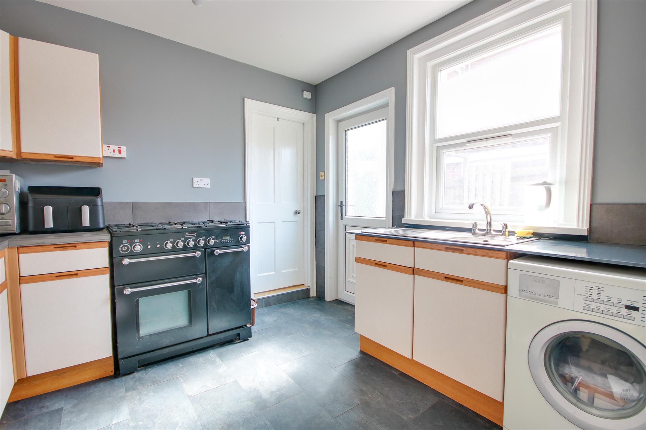 Smooth ceiling, double glazed window to side, double glazed door to side, a range of wall, base and drawer units with work surface over, sink and drainer inset, space for appliances, wall-mounted boiler, radiator, door to: