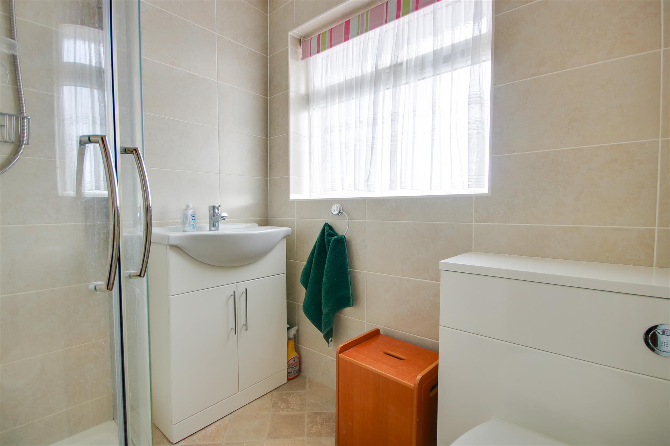 Textured ceiling, double glazed obscured window to rear, shower cubicle, WC, wash hand basin, tiled walls, radiator.